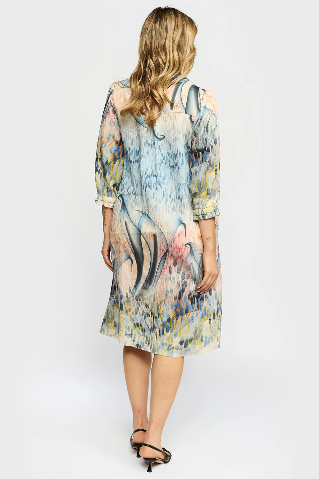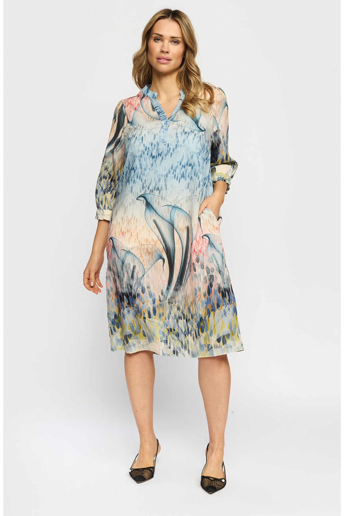 Det fine print med bløde farver giver kjolen et eksklusivt udtryk, som gør den oplagt både til hverdag og særlige anledninger.