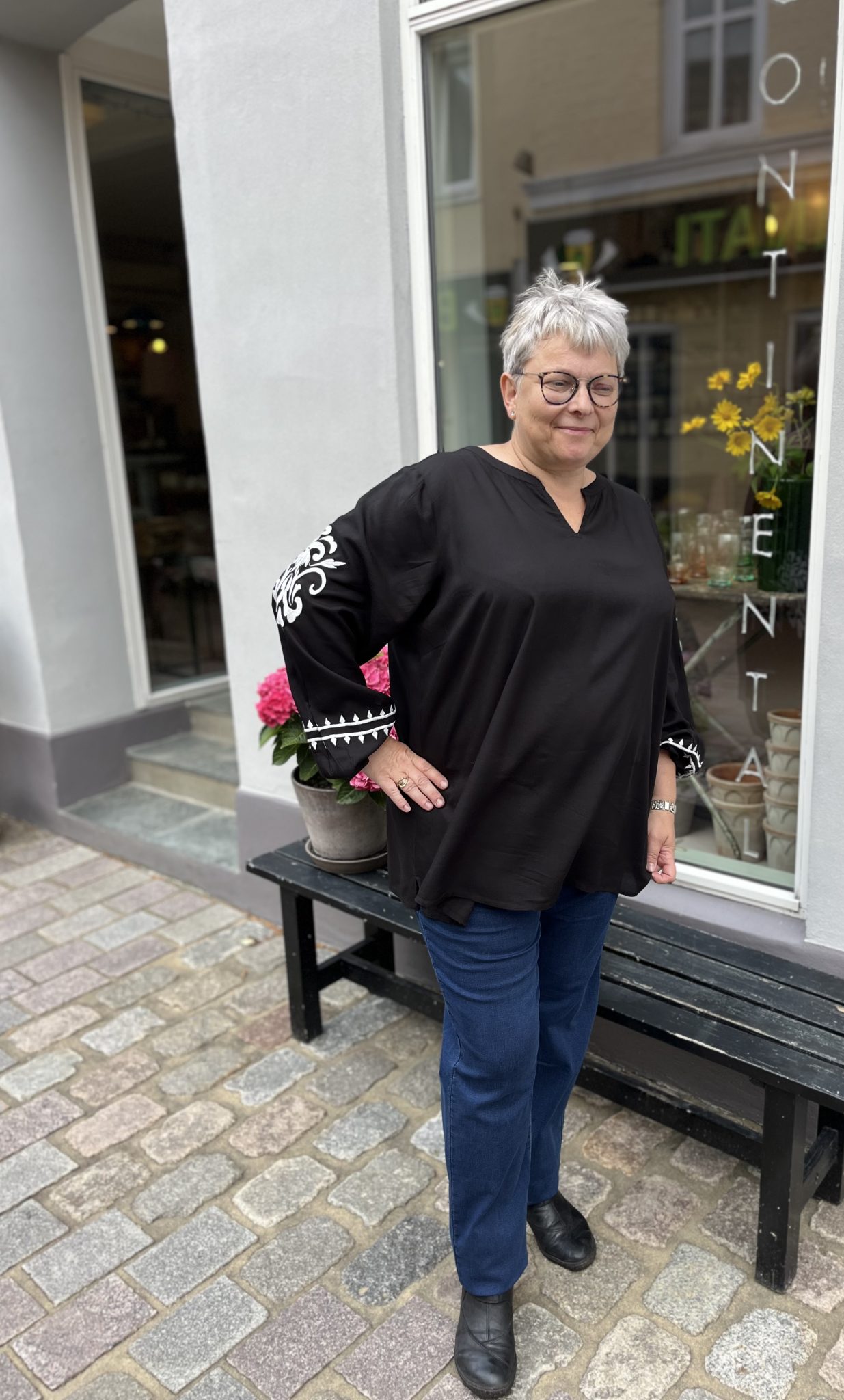 Super sød Viskose bluse fra Zhenzi. Blusen er med broderi detaljer på ærmerne, den er med v-hals og er lange Ærmer med elastikkant forneden. Denne fine bluse er et must have til garderoben her til efteråret.