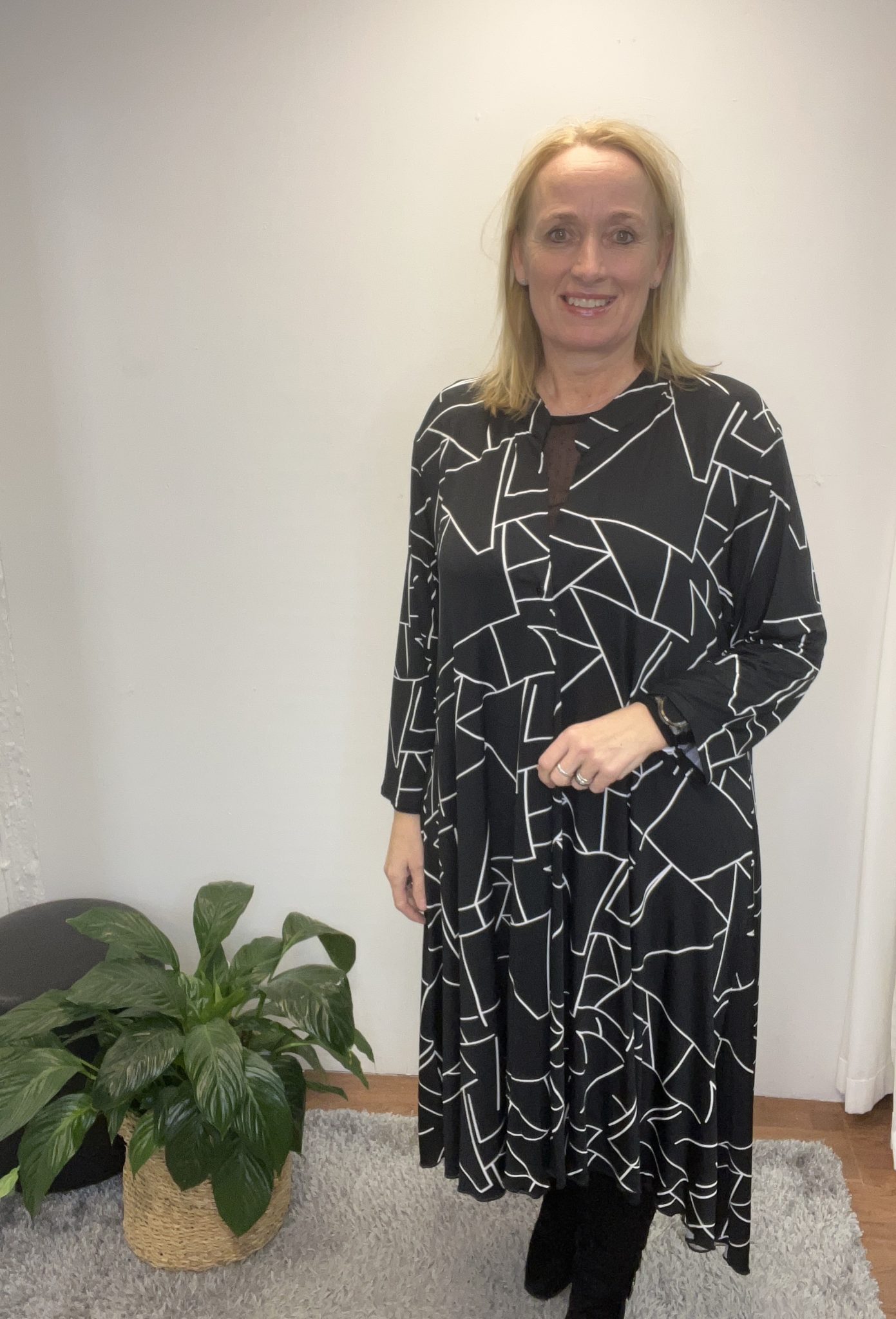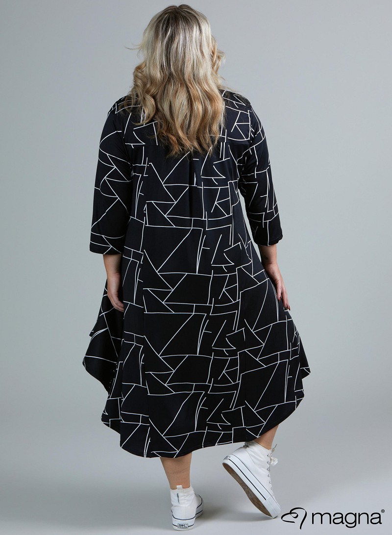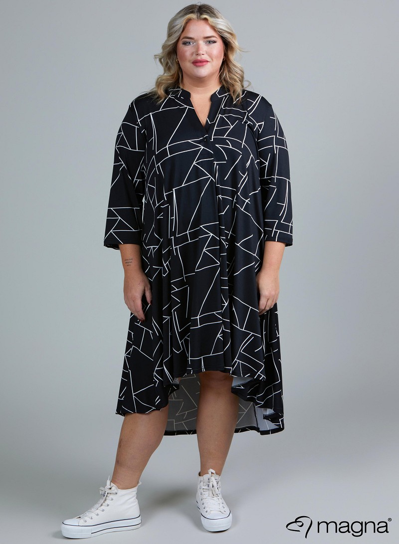 Denne flotte kjole fra Magna er korter foran og den er lang bagpå. Kjolen går ned i v-hals og den er med 3/4 ærmer, denne kjole er så fin både med et par hvide speakers eller et par støvler. Den kan både bruges til hverdag og fest
