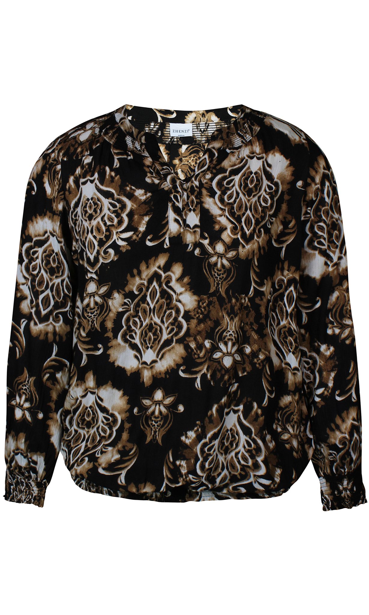 Sød Viskose crepe printet bluse fra Zhenzi med elastik i den nederste kant, hvilket gør at man nemt kan sætte blusen, så den skjuler maven. Denne skønne bluse er med V-hals og den har lange ærmer med elastik kant forneden.