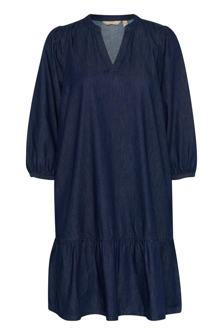 Denne denim kjole fra Cultura er et must have til garderoben. Denim bliver meget hot til efteråret, og denne skønne og bløde kjole fra Culture er så skøn at have på. Kjolen er med 3/4 ærmer, den går lige under knæet og har en flæse kant forneden. Kjolen er med lommer