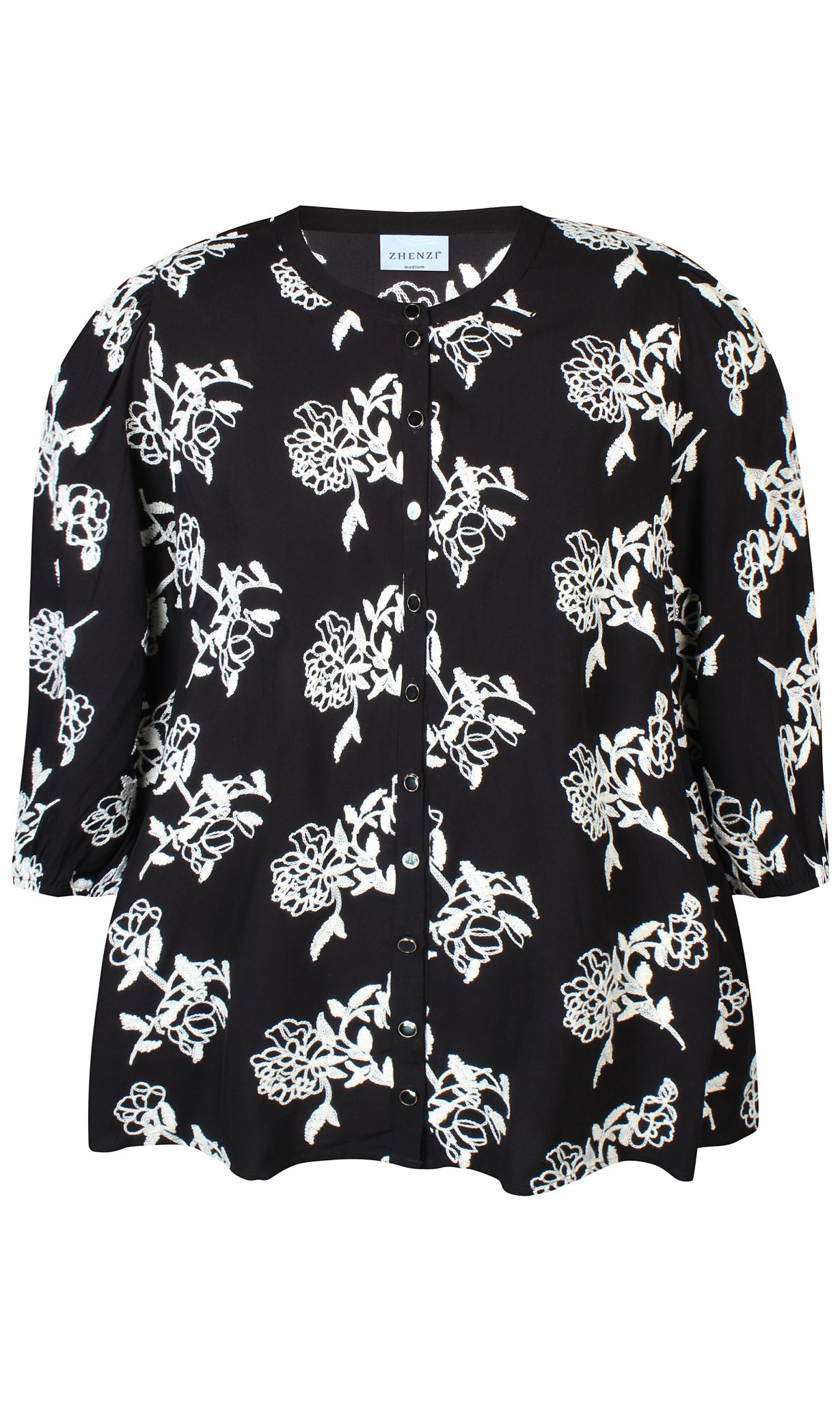 Elegant skjorte i 100% Viskose med broderet blomster på skjorte fra Zhenzi. Skjorten er gennemknappet og der er 3/4 Ærmer med elastikkant. Mangler du en lækker skjorte hertil