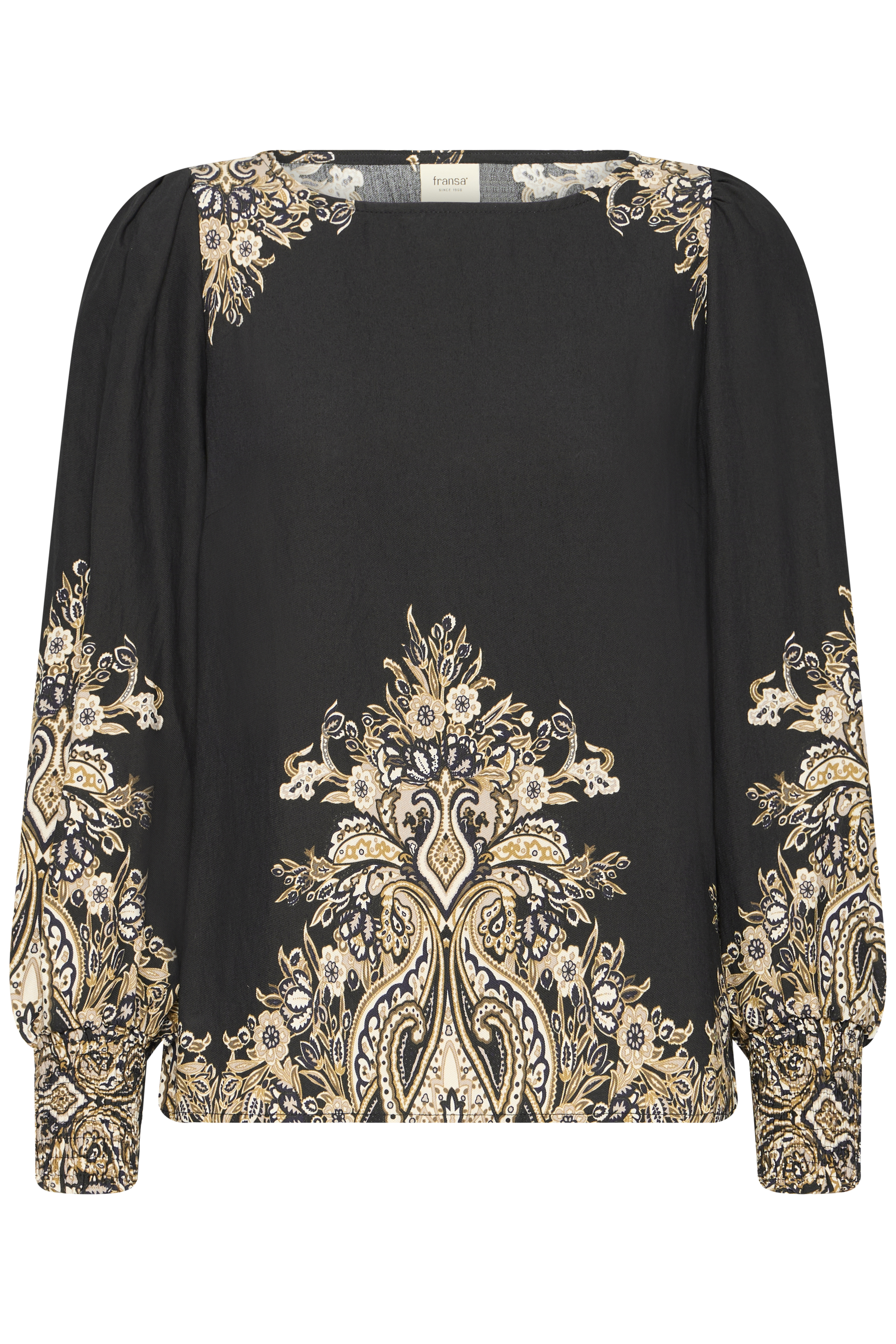 Opgrader din garderobe med denne smukke bluse fra Fransa. Blusen har et stilfuldt sort grundlag med et unikt paisley-inspireret print i beige og gyldne nuancer, der giver et eksklusivt look. De lange ærmer afsluttes med smock-detaljer, som sikrer en flot pasform og et feminint udtryk. Perfekt både til hverdag med jeans og til festlige anledninger med en elegant nederdel eller bukser.