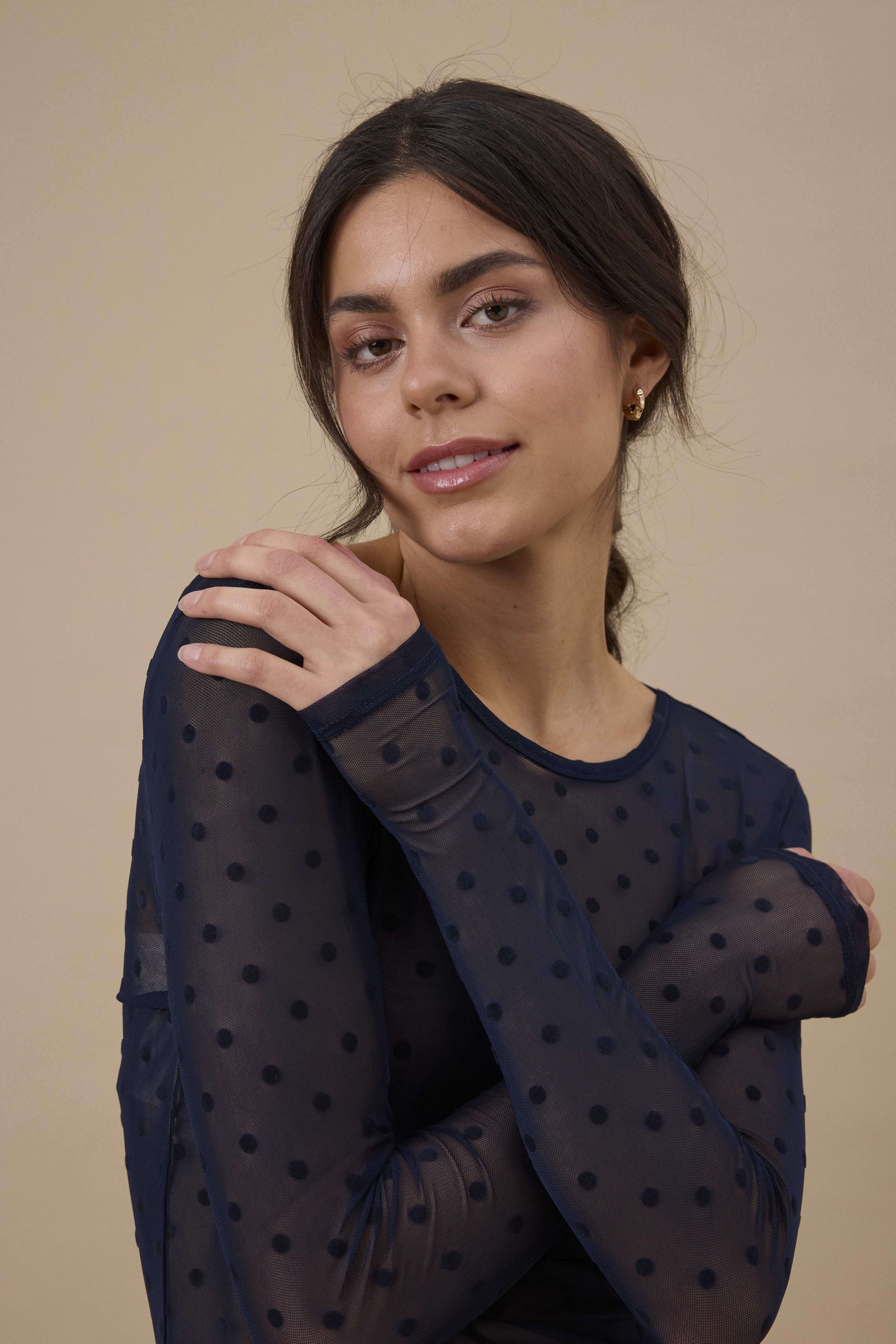 Den transparente kvalitet med fine tone-i-tone prikker giver et feminint og eksklusivt udtryk. Blusen er perfekt til lag-på-lag styling og kan bruges under kjoler, strik, veste eller blazere for at skabe et moderne og gennemført look.