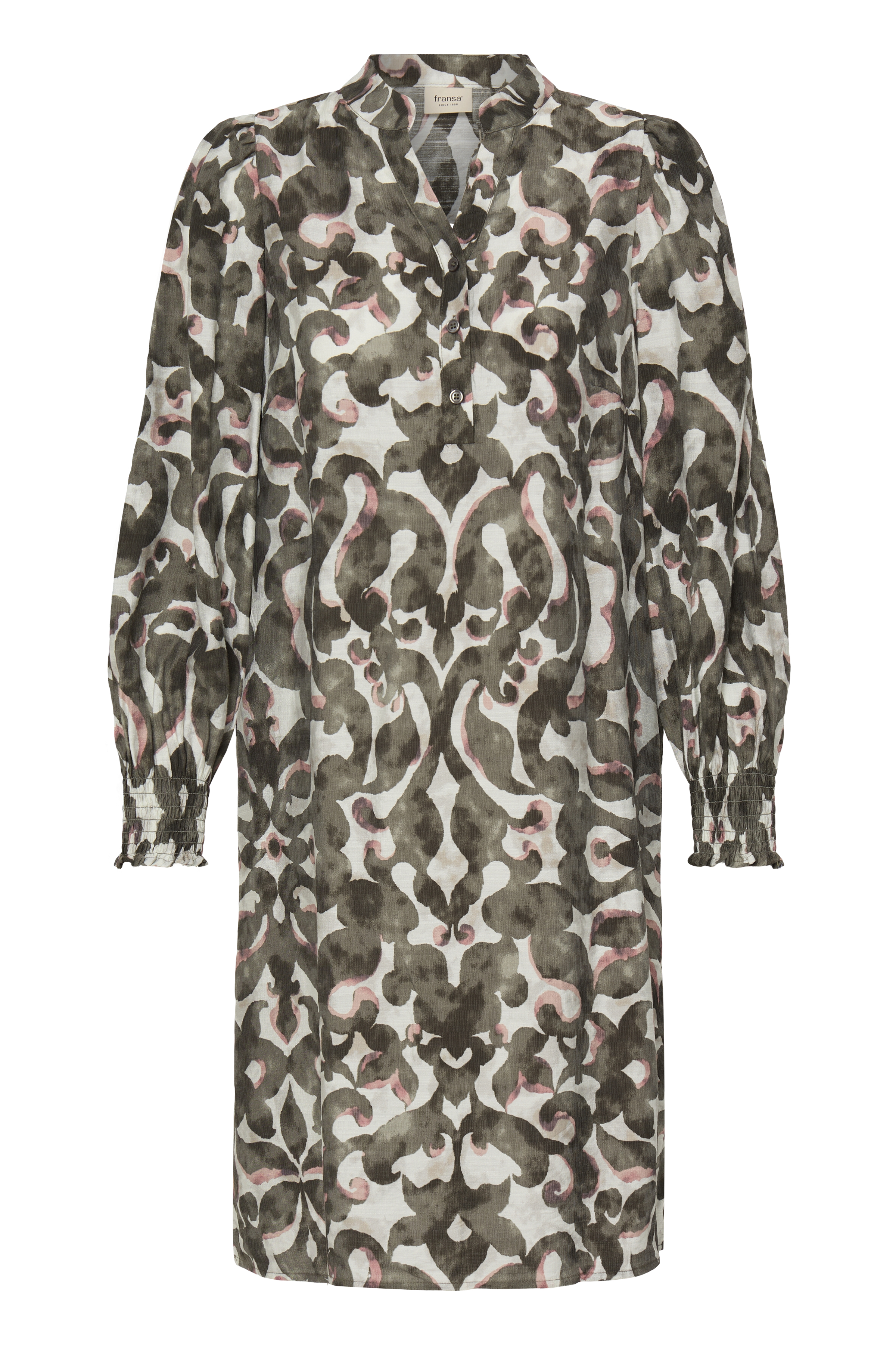 Den flotte v-hals med knapper, de let puffede ærmer og elastikkanten ved håndleddet giver kjolen et elegant og moderne udtryk.