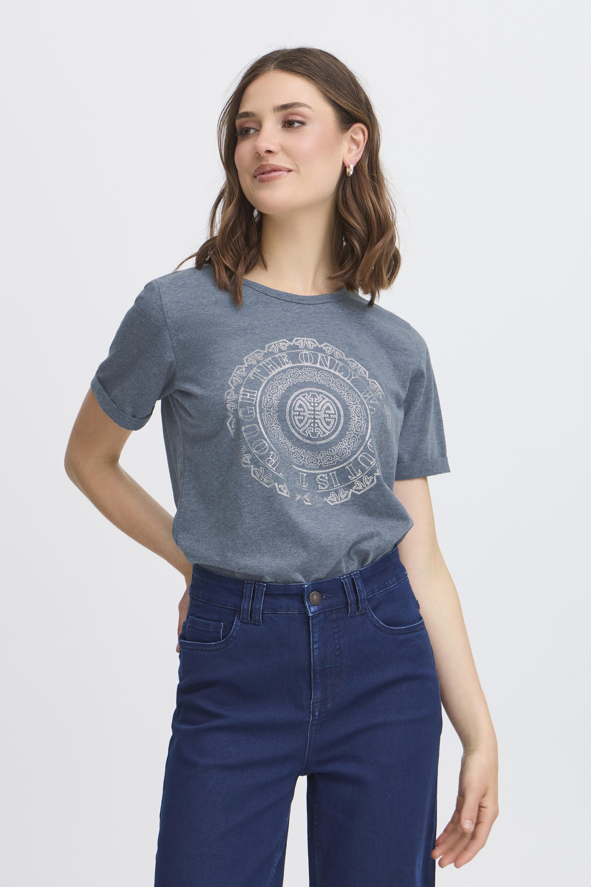 Opgrader din basisgarderobe med denne smarte T-shirt fra Fransa. T-shirten er lavet i en blød meleret blå kvalitet med rund hals og kort ærme, der giver et afslappet og stilfuldt look. På fronten prydes den af et dekorativt print, som tilfører et feminint og moderne twist.