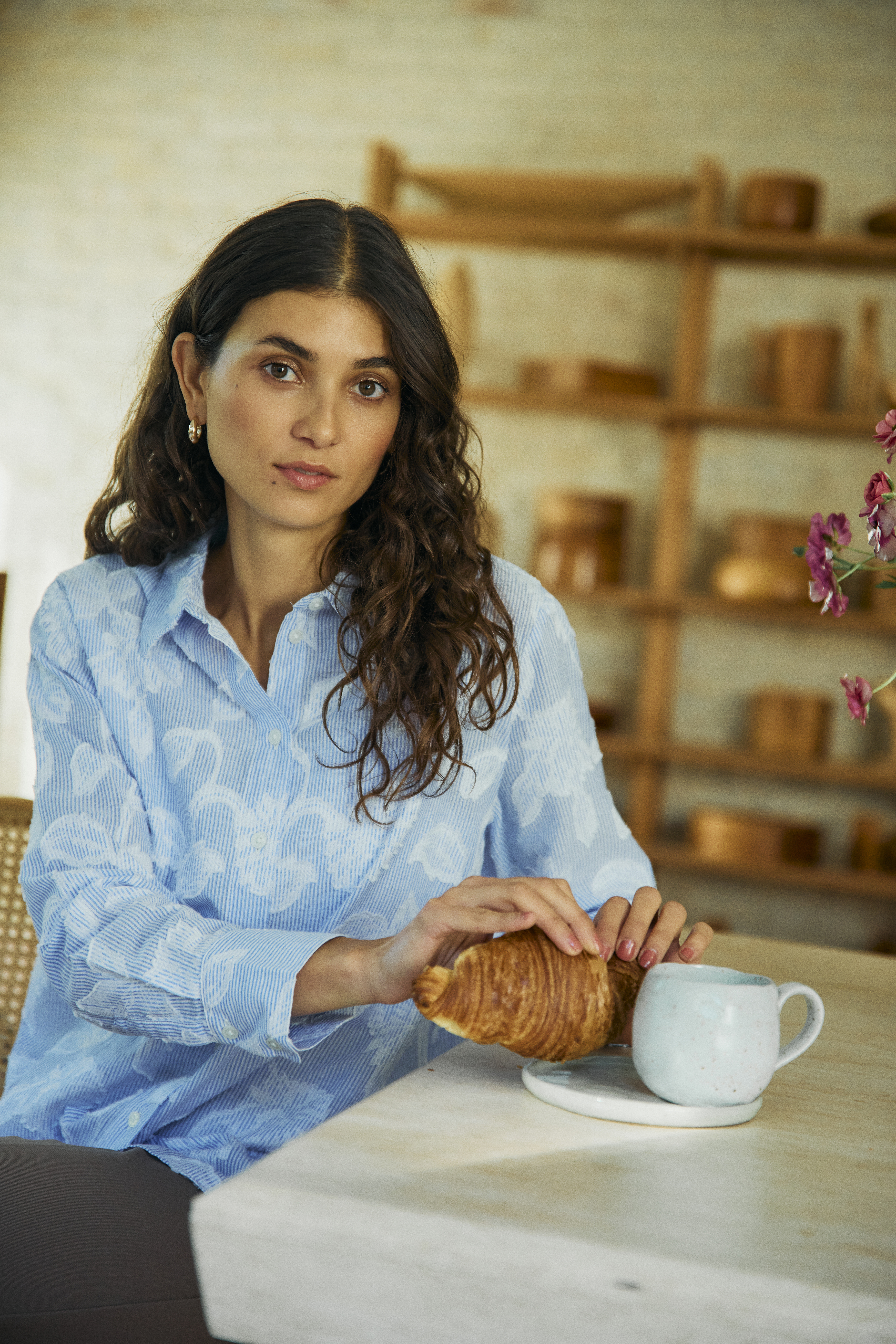 Elegant skjorte bluse fra Fransa i en lækker, let kvalitet af 100% bomuld. Den lyseblå bund med hvide blomsterprint og fine striber giver et friskt og feminint udtryk. Skjorten har klassisk krave, knaplukning hele vejen ned og lange ærmer med manchet. Pasformen er lidt stor i størrelsen, hvilket giver en afslappet og behagelig stil – perfekt både til hverdag og mere pæne lejligheder.