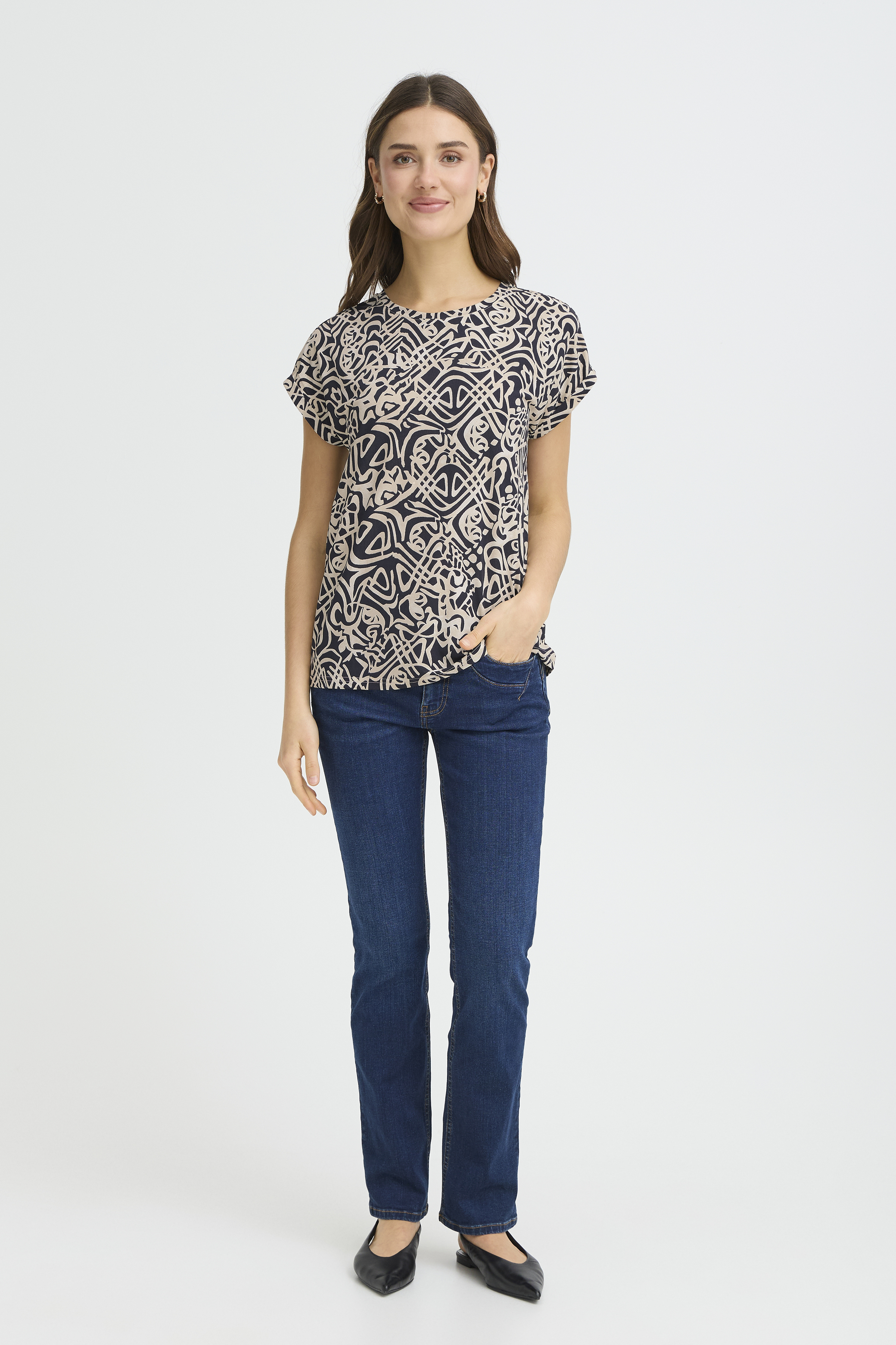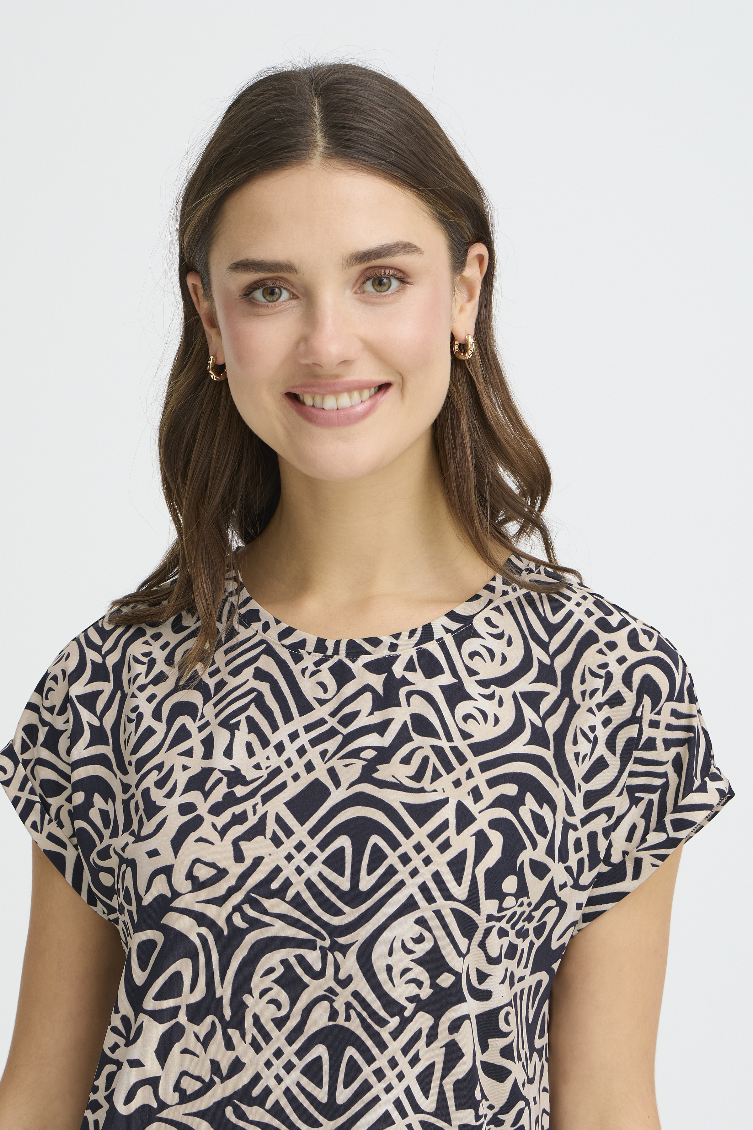 Smuk og let T-shirt fra Fransa i en flot marineblå nuance med et moderne, grafisk print. T-shirten er fremstillet i en super behagelig kvalitet af 95% polyester og 5% elastane, som gør den strækbar, blød og nem at have på hele dagen.
