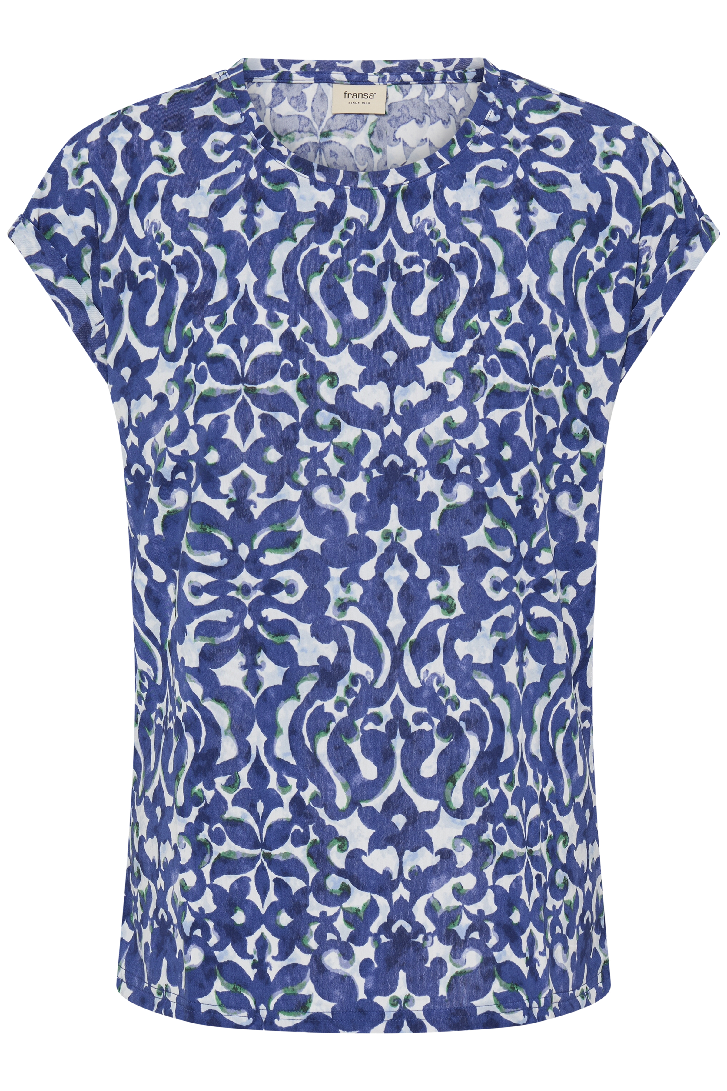 Smuk og let T-shirt fra Fransa i en flot blå nuance med et moderne, grafisk print. T-shirten er fremstillet i en super behagelig kvalitet af 95% polyester og 5% elastane, som gør den strækbar, blød og nem at have på hele dagen.