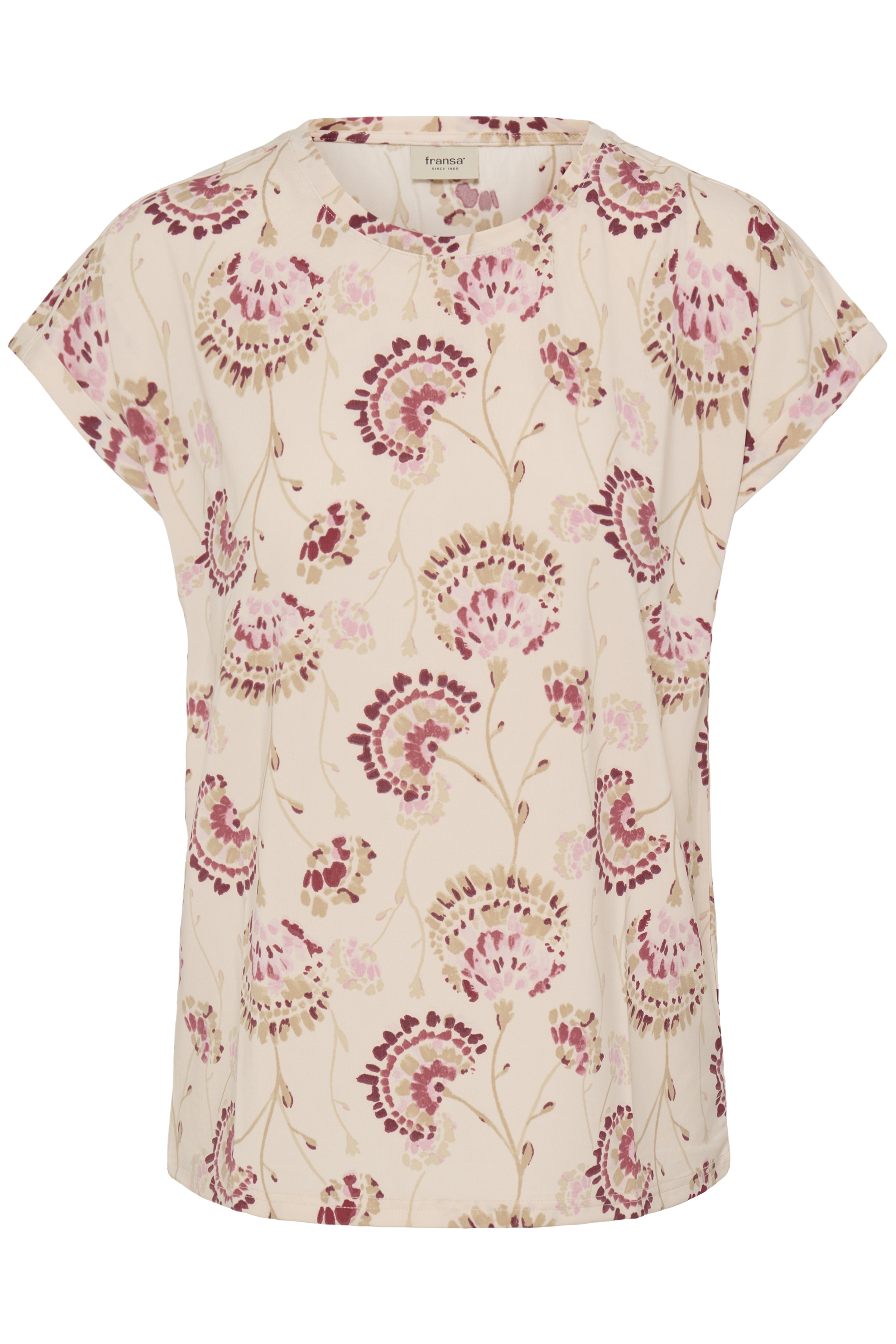 Smuk og let T-shirt fra Fransa i en flot rosa nuance med et moderne, grafisk print. T-shirten er fremstillet i en super behagelig kvalitet af 95% polyester og 5% elastane, som gør den strækbar, blød og nem at have på hele dagen.