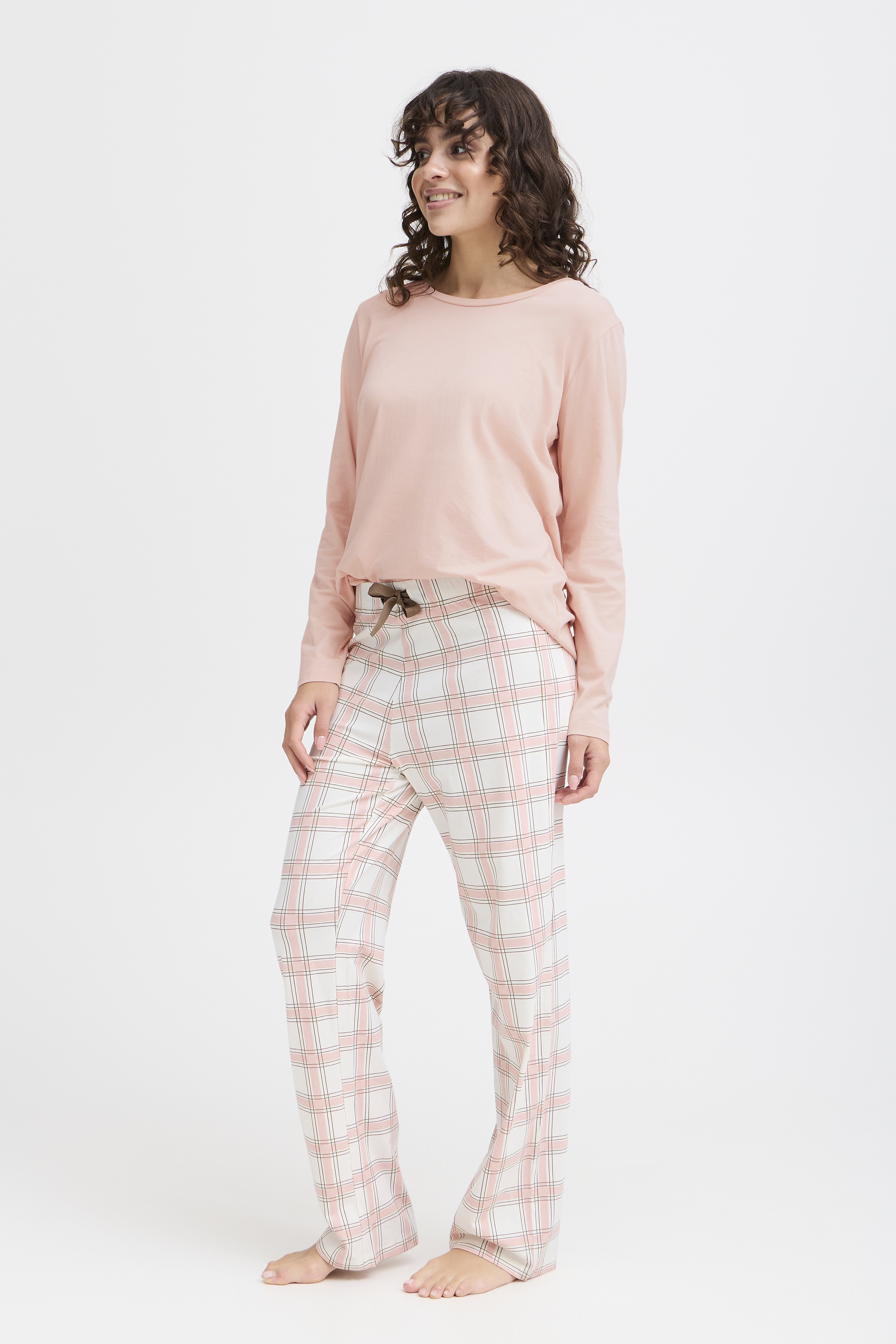 Sættet består af en langærmet bluse i en smuk rosa farve og et par super behagelige ternede bukser med elastik og bindebånd i livet.