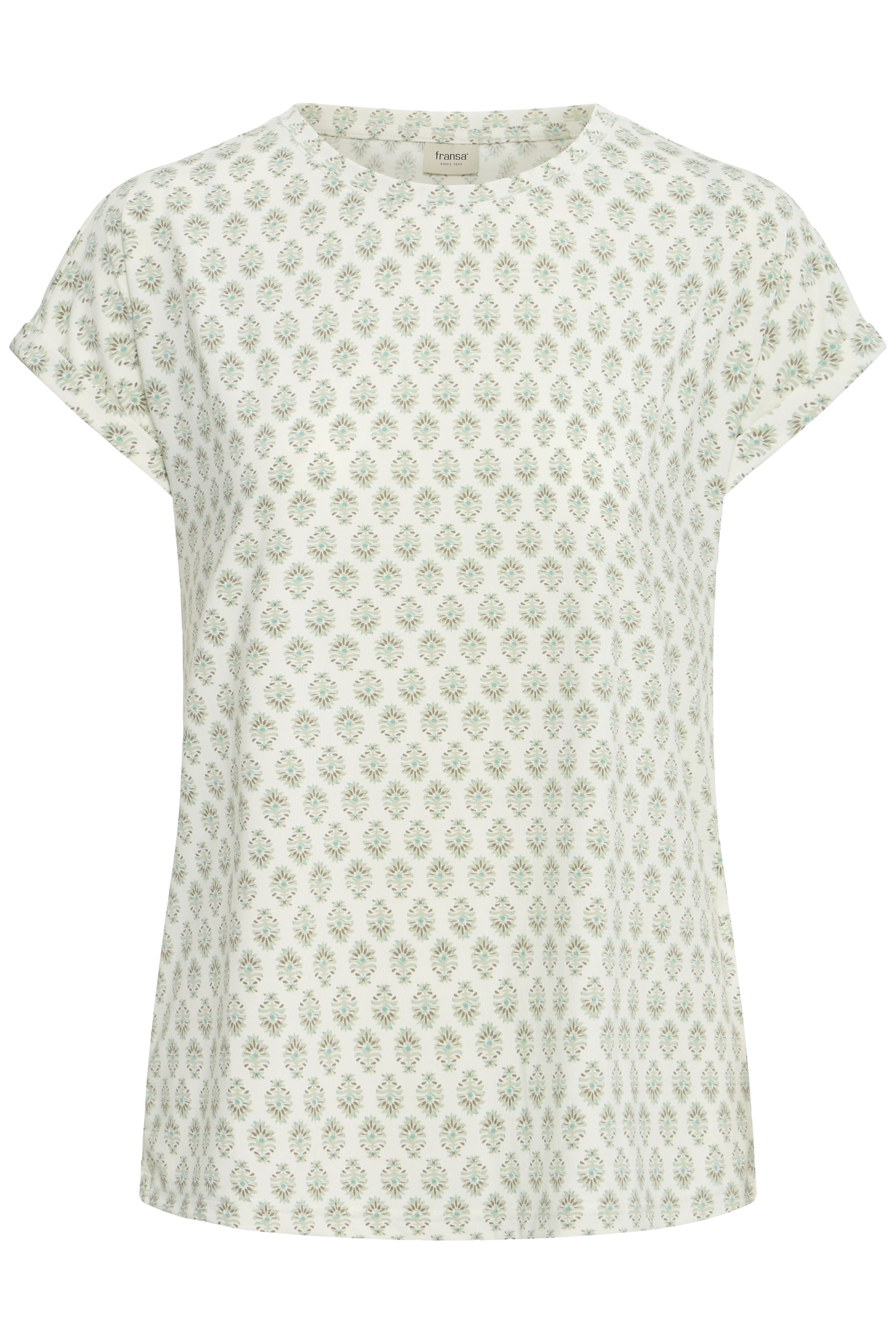 Smuk og let T-shirt fra Fransa i en flot råhvid/army med et moderne, grafisk print. T-shirten er fremstillet i en super behagelig kvalitet af 95% polyester og 5% elastane, som gør den strækbar, blød og nem at have på hele dagen.