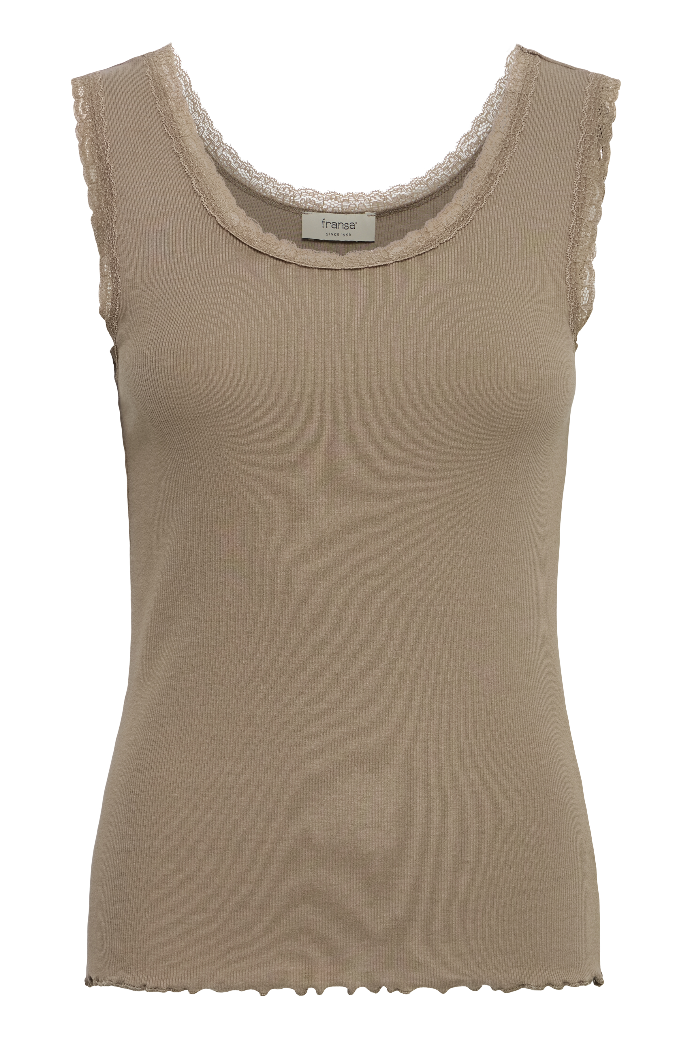 Toppen har en feminin blondekant ved udskæring og ærmegab, som giver et elegant og blødt udtryk – perfekt både alene eller som lag-på-lag under strik, blazer eller kjole.