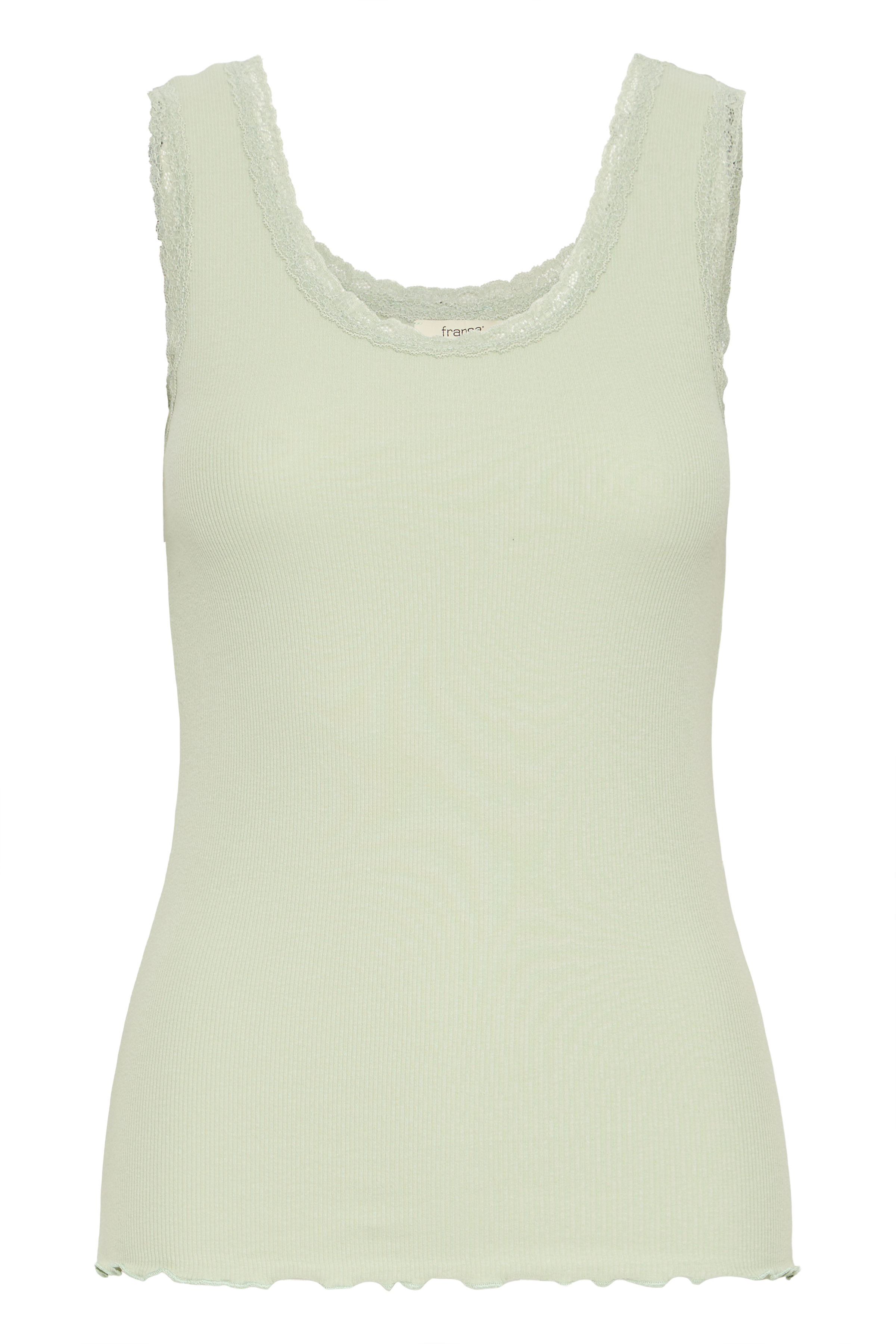 Toppen har en feminin blondekant ved udskæring og ærmegab, som giver et elegant og blødt udtryk – perfekt både alene eller som lag-på-lag under strik, blazer eller kjole.