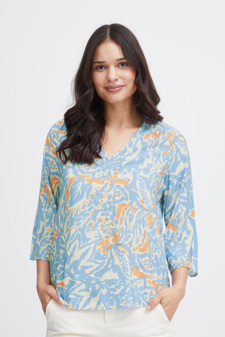 Flot bluse Frbita fra Fransa – i skønne forårs farver, bundfarven er råhvid med lysblå og den flotte nye fersken farvet. Blusen er med 3/4 ærmer og løs i ærmerne, blusen er med V-hals. Styl denne flotte bluse til et par jeans med et par sneakers