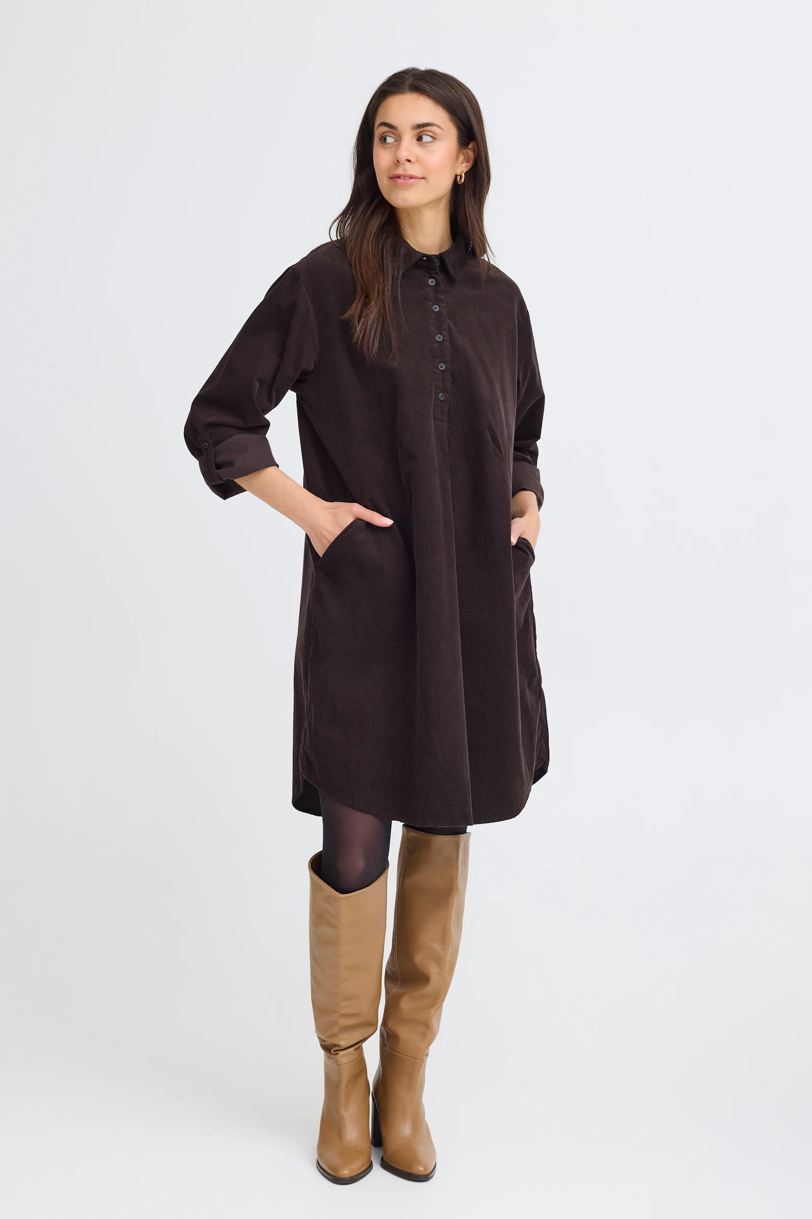 Blød og stilfuld babyfløjl kjole fra Fransa, designet med praktiske lommer og mulighed for at justere ærmerne til 3/4 længde. Den løse pasform og det enkle snit giver et afslappet, men elegant look, perfekt til både hverdag og afslappede anledninger. Fremstillet i en behagelig kvalitet, der føles skøn mod huden.