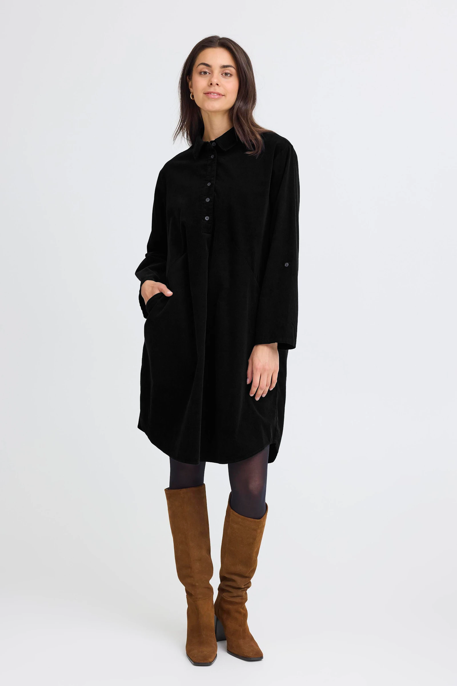 Blød og stilfuld babyfløjl kjole fra Fransa, designet med praktiske lommer og mulighed for at justere ærmerne til 3/4 længde. Den løse pasform og det enkle snit giver et afslappet, men elegant look, perfekt til både hverdag og afslappede anledninger. Fremstillet i en behagelig kvalitet, der føles skøn mod huden.
