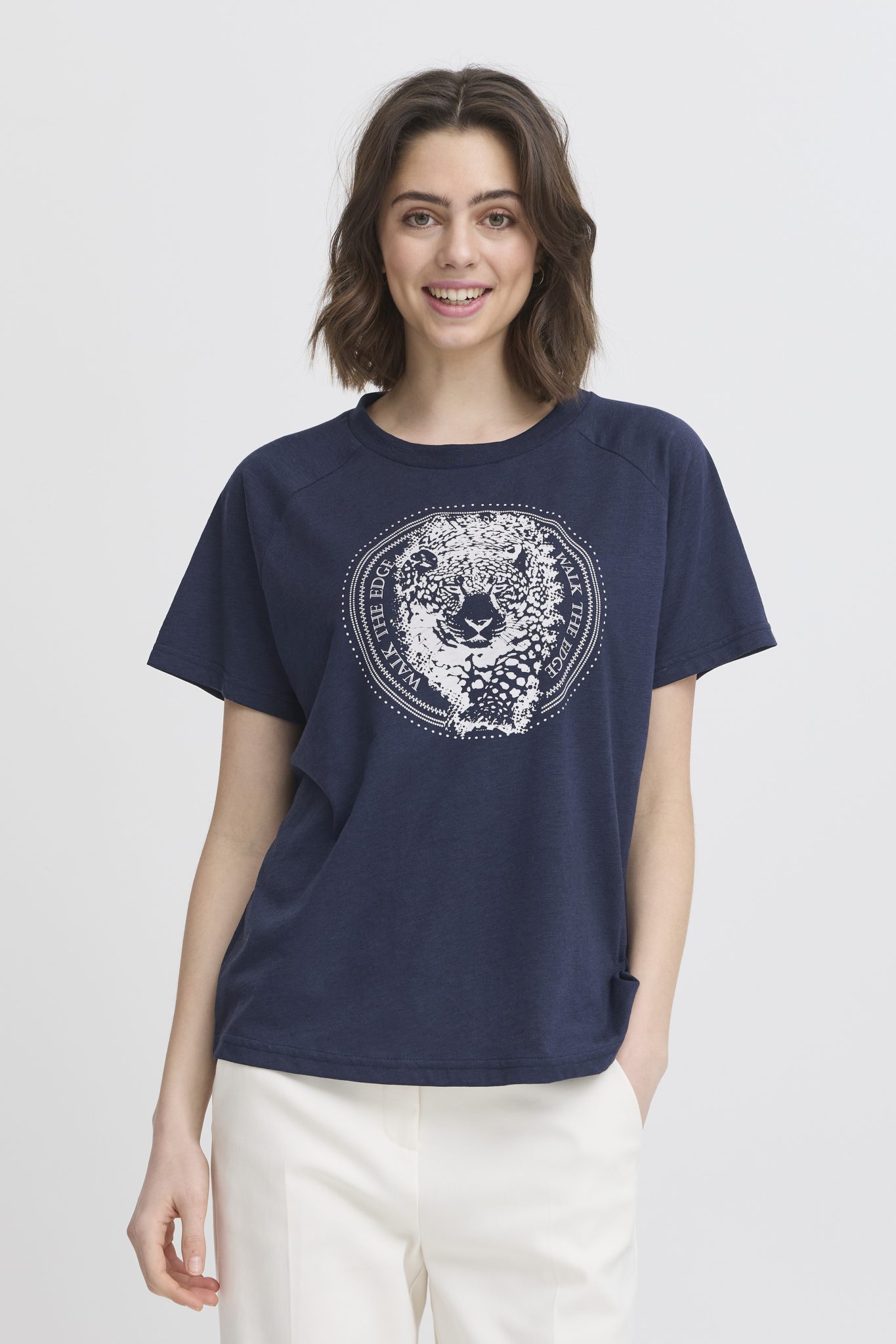 Denne t-shirt er fremstillet i høj kvalitet med loose fit pasform, regulær længde og korte ærmer. Den er lavet af en blanding af polyester og bomuld, som gør det både behageligt og slidstærkt. Denne T-shirt passer perfekt til et par jeans eller nederdel, og kan nemt dresses op eller ned til enhver lejlighed. Denne style er et uundværligt stykke i enhver garderobe.