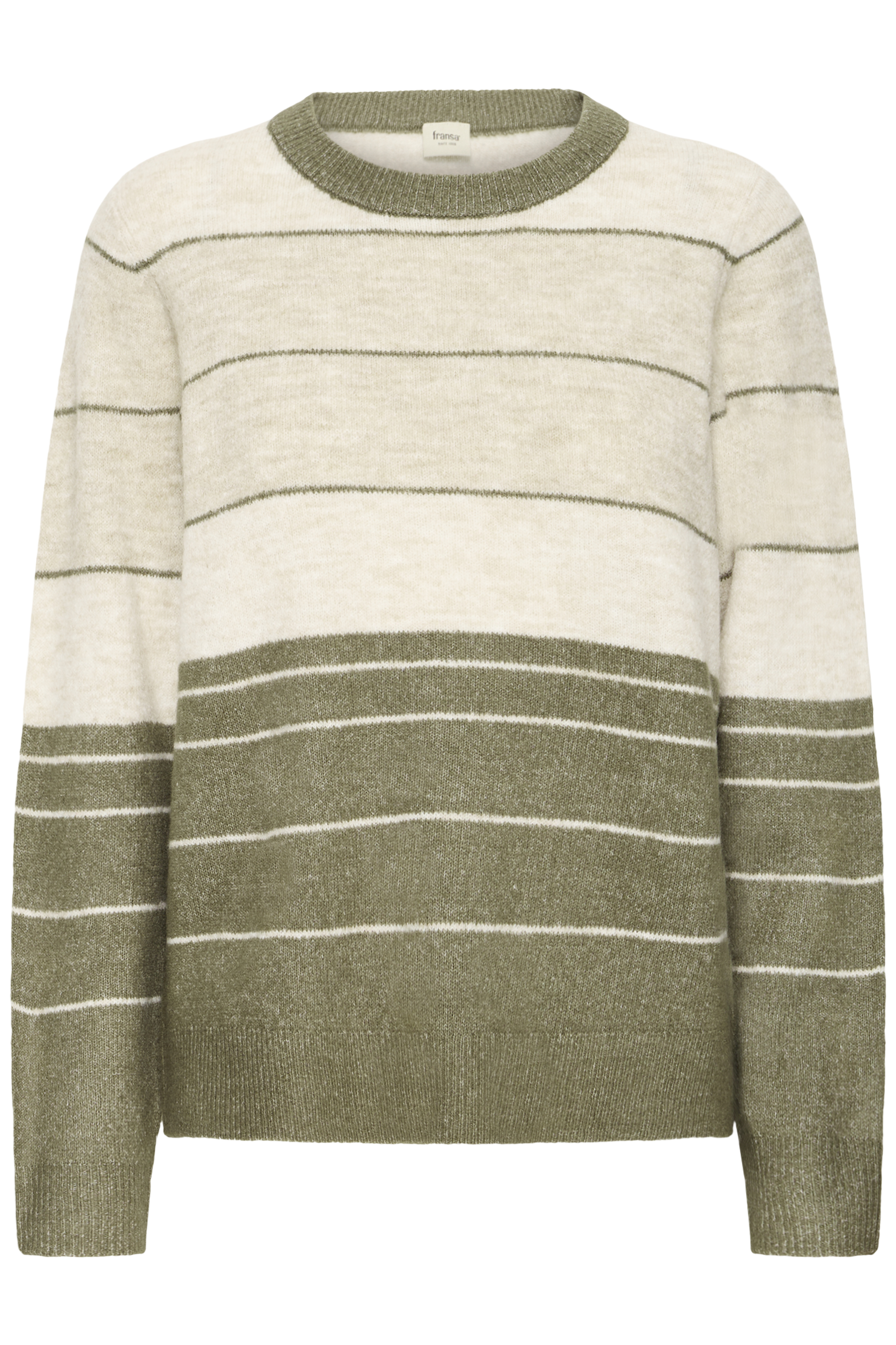 Efteråret kalder på blød og lun strik Denne skønne striktrøje fra Fransa har et klassisk stribet design i flotte Army og lyse nuancer. Den har en rund hals og en afslappet pasform, som gør den perfekt til et par jeans for et tidløst og casual look.