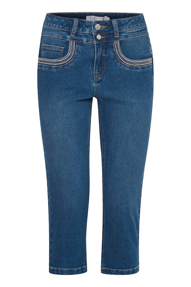 Capri Jeans fra Fransa, jeansen er med masser af stræk. der er lommer foran og bagpå. Der er pynt foran på lommerne. Capri bussen er super smart her til sommer med en top, og en sandal