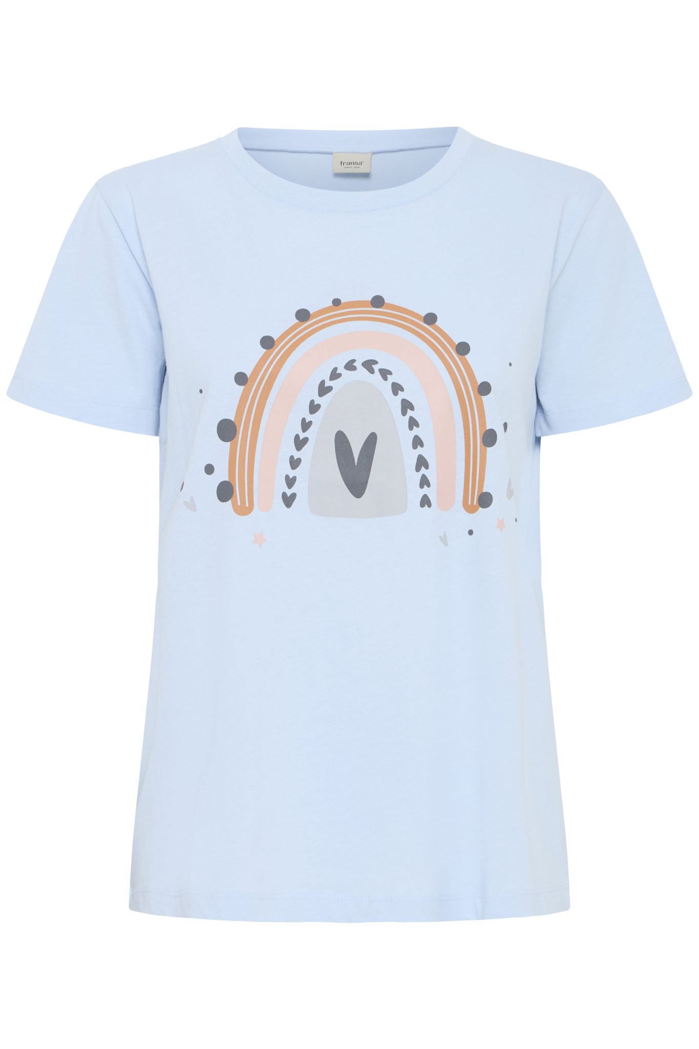 Fransa FRJeno T-shirt lyseblå med front print. Denne fine, klassiske og feminine Fransa T-shirt er i en skøn kvalitet 100% Bomuld, hvilket gør kvaliteten og materialet super lækkert og behagligt at have på!