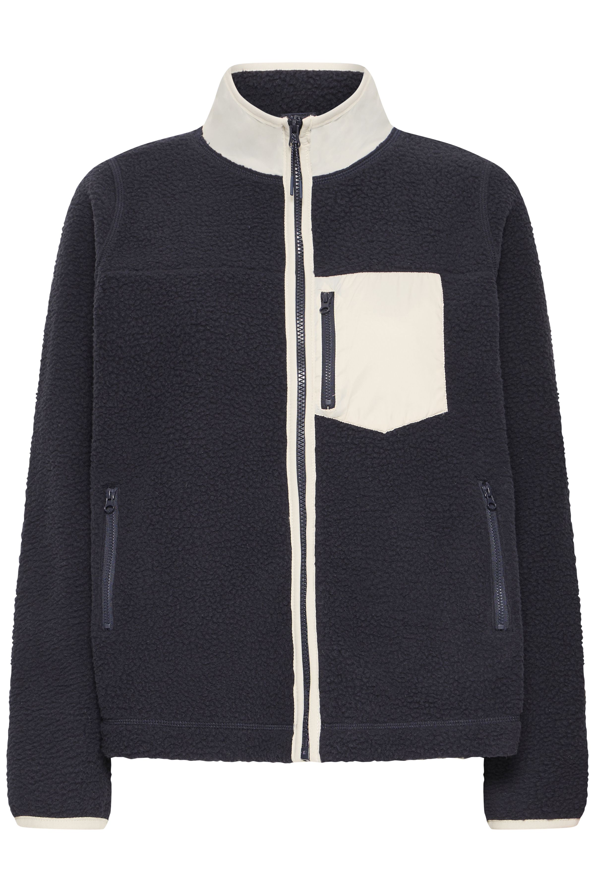 Hold dig varm og stilfuld i denne flotte fleece jakke fra Fransa. Jakken er designet i en klassisk mørkeblå farve med kontrastdetaljer i lys beige, der giver et sporty og moderne udtryk.