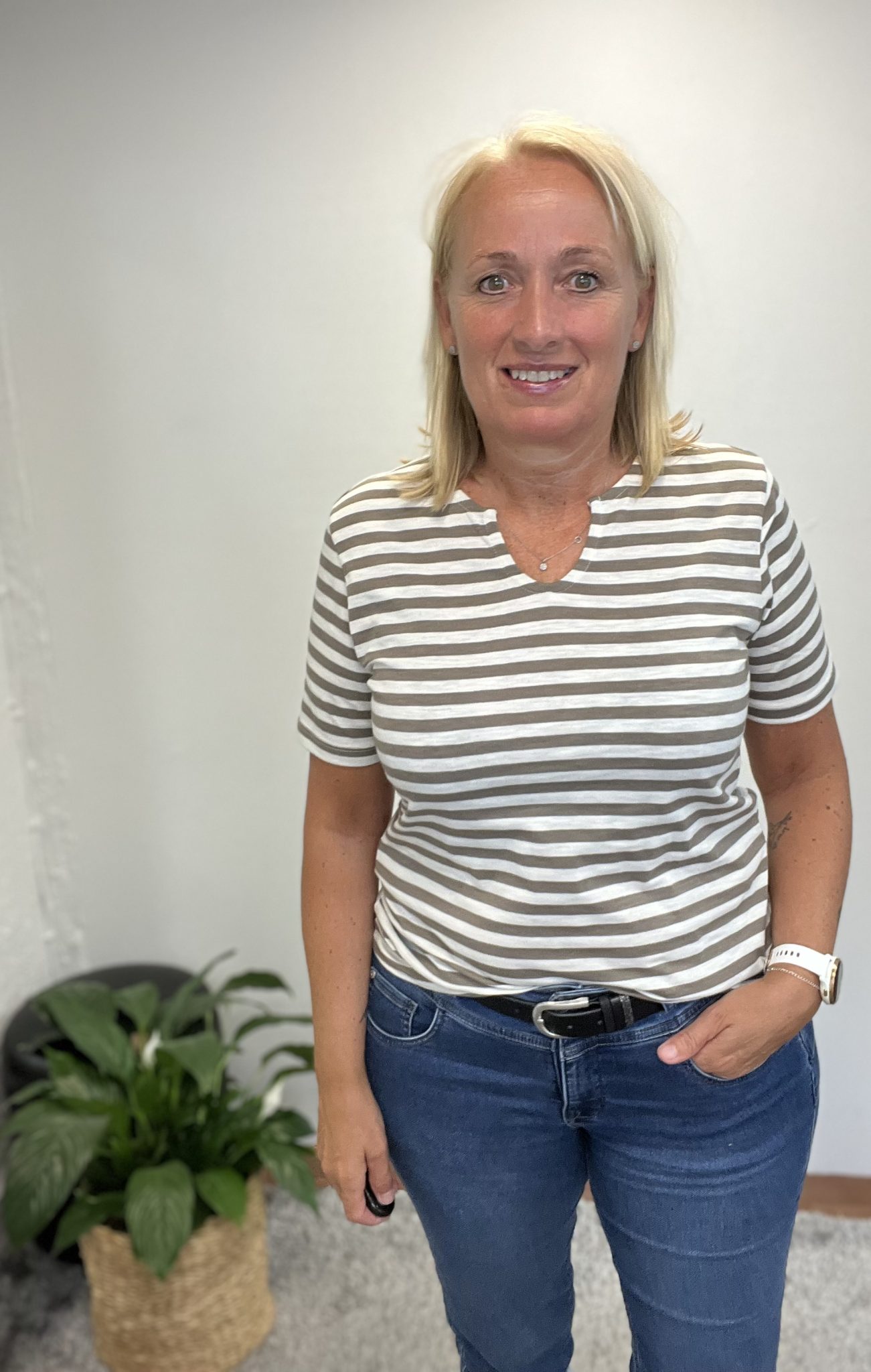 Skøn t-shirt fra Fransa i skøn kvalitet. T-shirten er i stribet i den nye valnød farve med råhvid. T-shirten er med kort ærme og et lille v-hals. T-shirten er lille i størrelsen, jeg anbefaler og gå en størrelse op