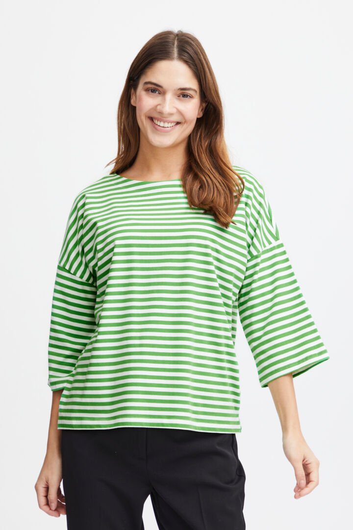 Denne langærmede T-shirt fra Fransa er en del af vores eksklusive udvalg i høj kvalitet strikkede stoffer. Med et oversized fit og regulerbar længde er den både behagelig og trendy. 3/4-ærmerne giver T-shirten et casual touch. Sæt den sammen med et par skinny jeans eller en højtaljet nederdel for et trendy look. Den er fremstillet med 95% bomuld og 5% elastan for ultimativ komfort.
