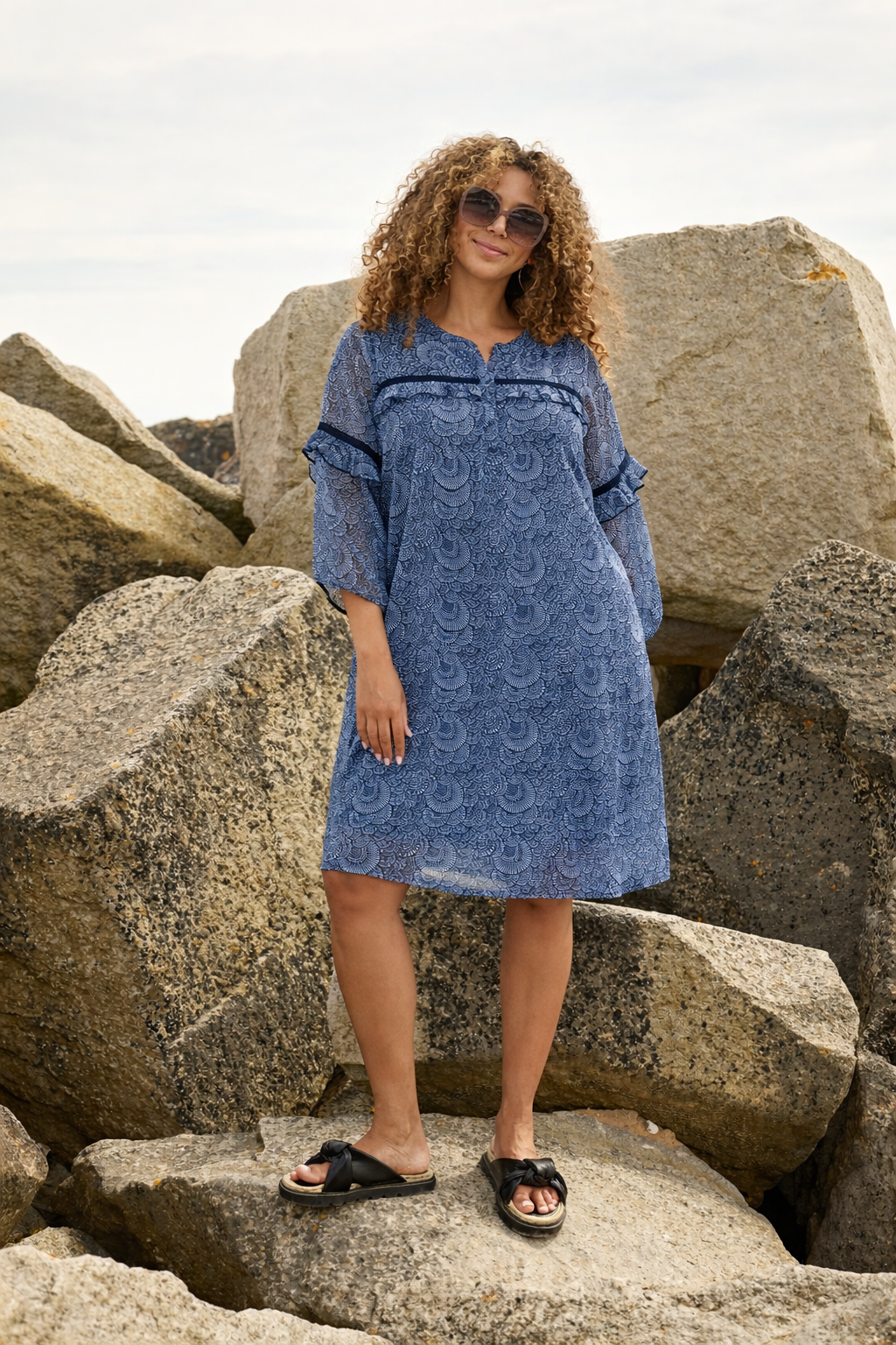 Smuk chiffon kjole fra Zhenzi i et elegant blåt mønster, designet til kvinder med former. Kjolen er fremstillet i let og luftig chiffon med et blødt viskose jersey-foer under, som sikrer høj komfort og en behagelig pasform hele dagen.