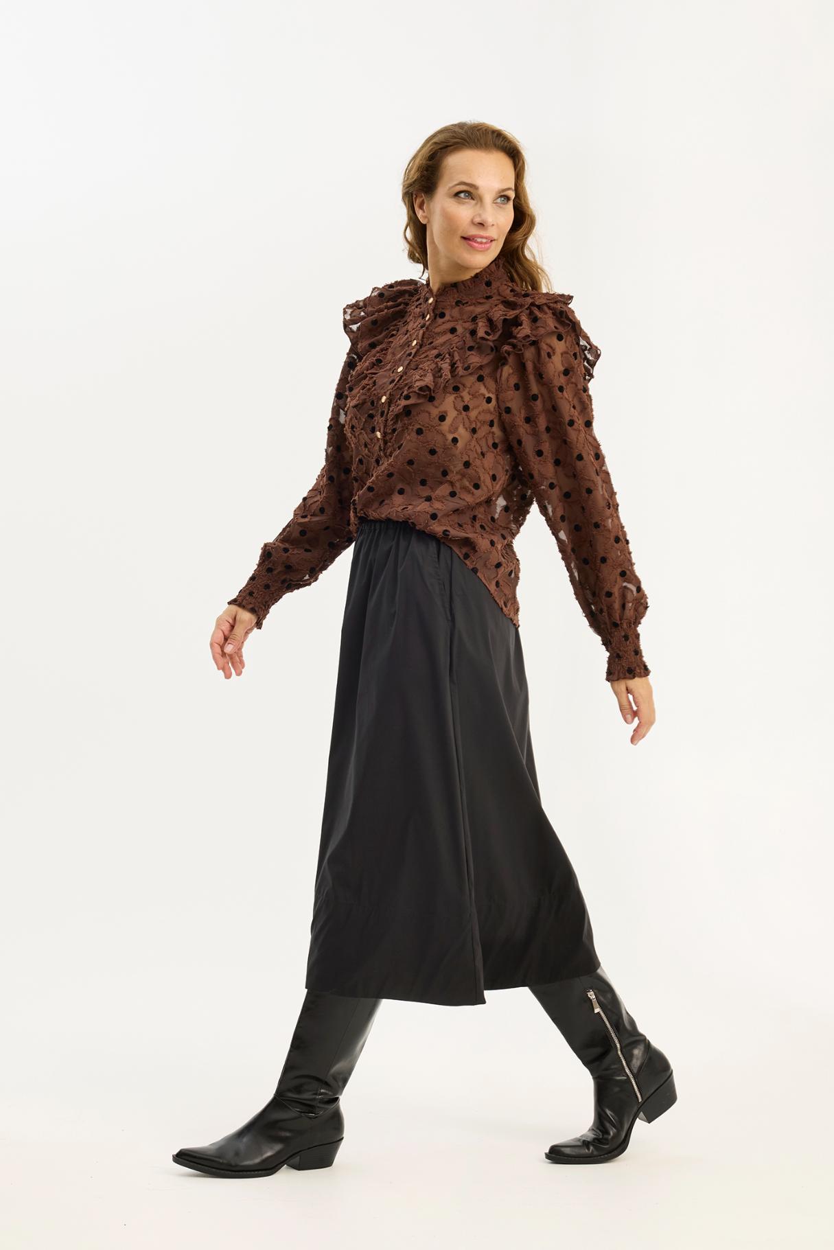 Smuk og elegant bluse fra InFront, der emmer af stil og personlighed. Blusen har et eksklusivt udtryk i den flotte brune nuance med feminine flæsedetaljer og et lækkert prikket mønster, der giver den et unikt twist. Den er designet med smukke knapper foran, lange ærmer og let struktur i stoffet, som gør den perfekt til både hverdag og fest.