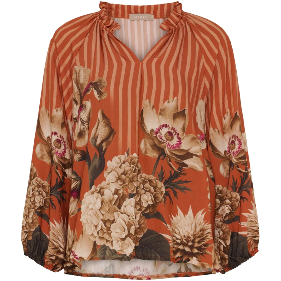 Marta bluse i rust striber med smuk blomsterpragt