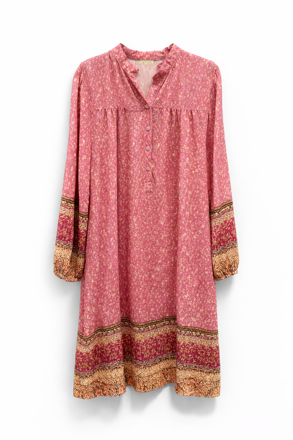 Kjolen har et feminint og let boheme-inspireret udtryk med flot mønster, fine farvedetaljer i kanten og ved ærmerne samt en løs og behagelig pasform.