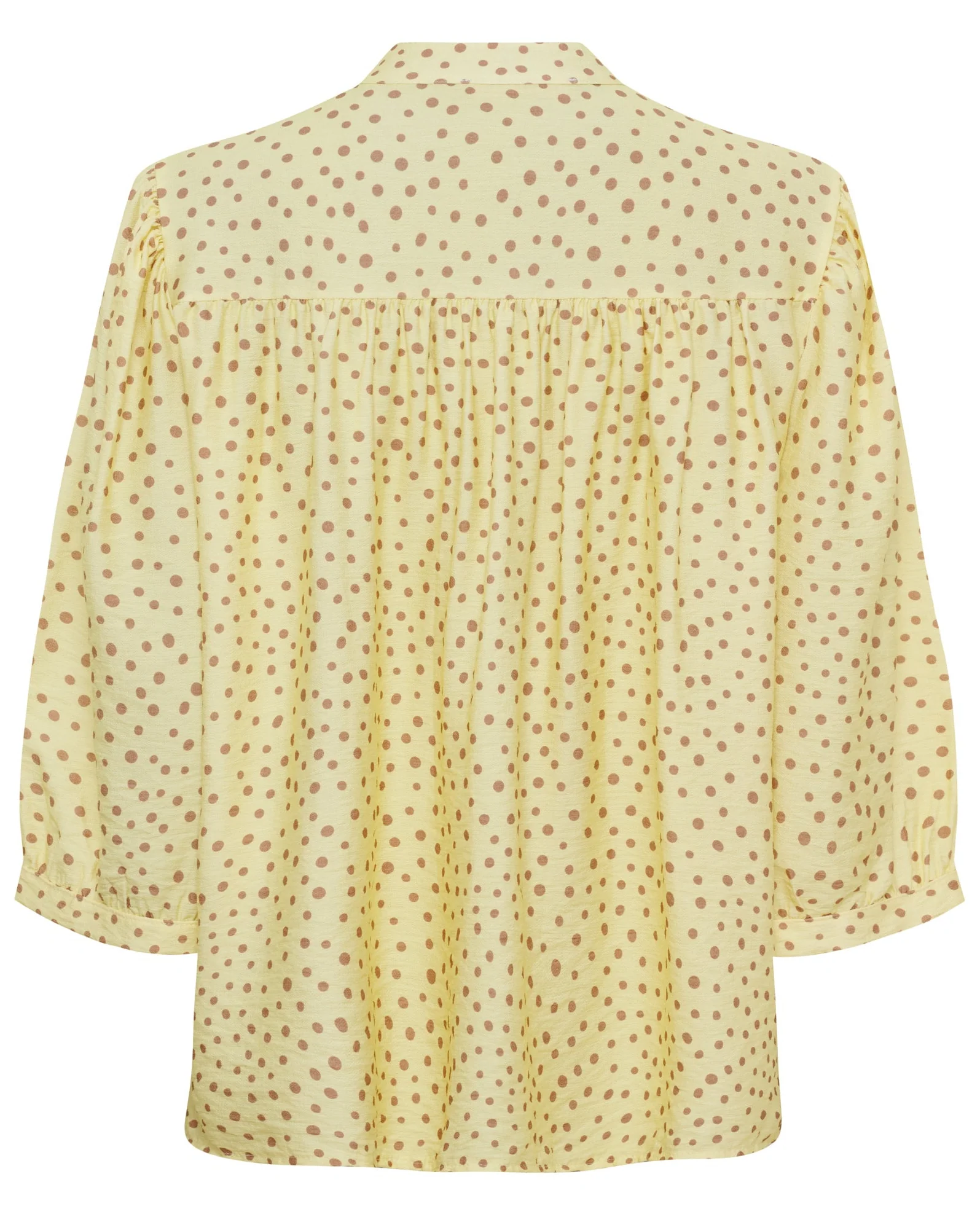 Blusen er lavet i en let og behagelig kvalitet med 90% viskose og 10% nylon, som giver et flot fald og en blød fornemmelse mod huden. De fine prikker giver et klassisk og stilfuldt look, der nemt kan styles til både hverdag og pænere brug.
