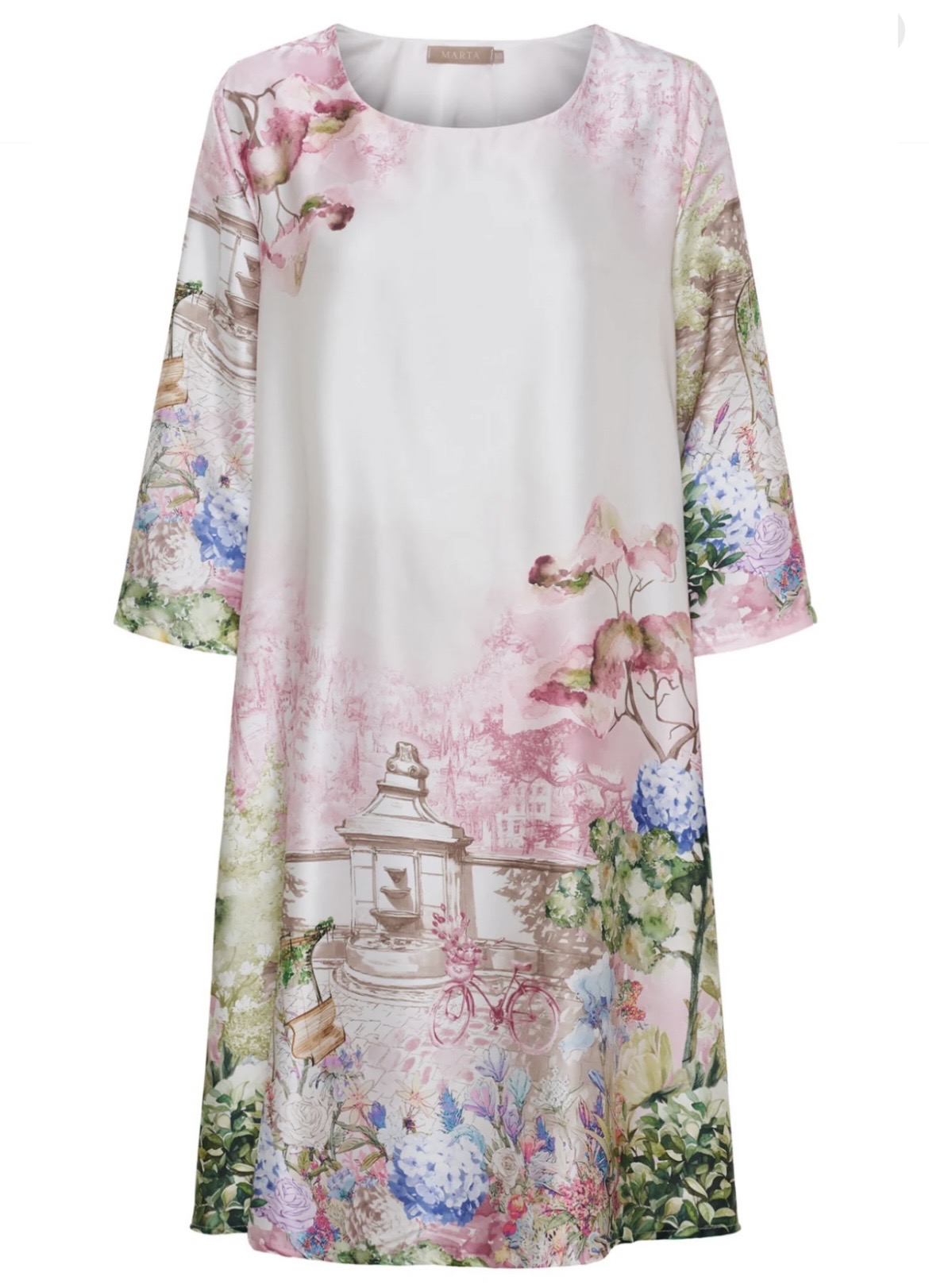 Smuk og iøjnefaldende kjole fra Marta du Château med et detaljerigt og romantisk print inspireret af blomster og hyggelige havemiljøer. De fine farver og det kunstneriske motiv giver kjolen et unikt og feminint udtryk.