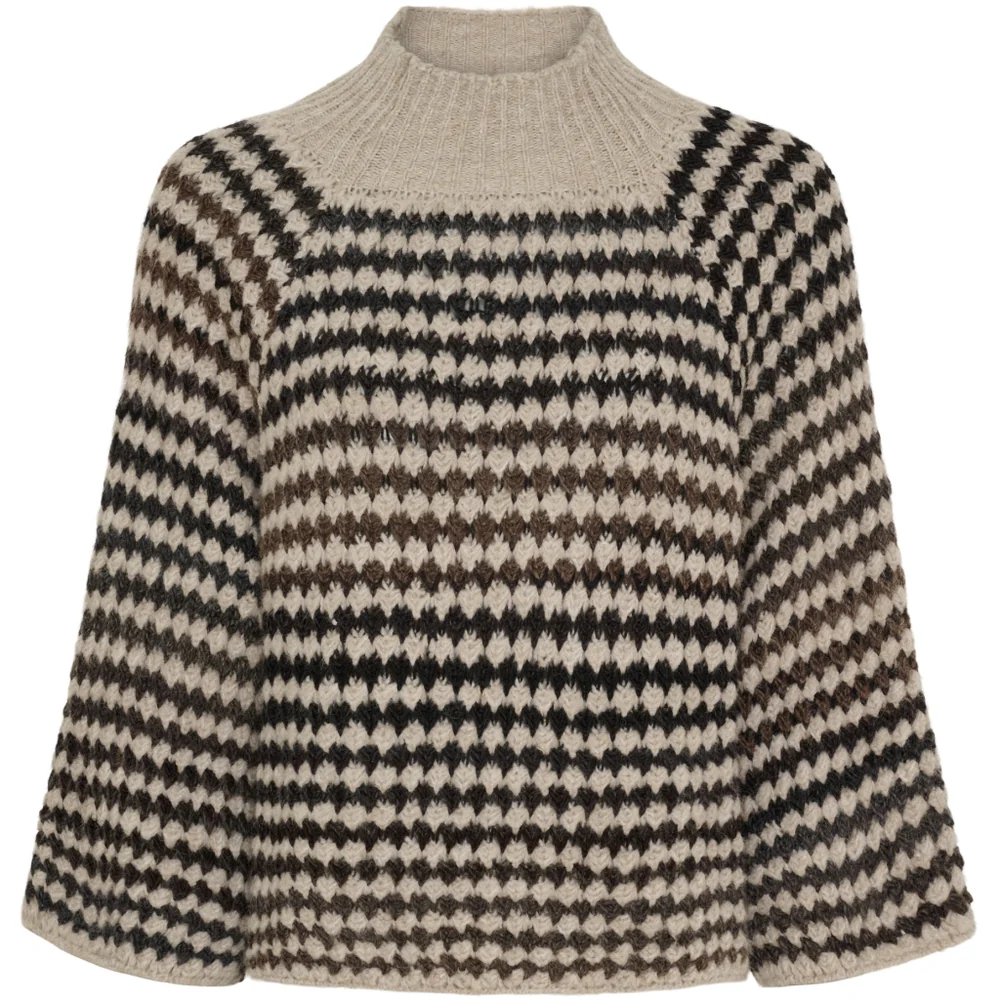 Blød og chunky striktrøje fra Marta du Château i flotte efterårsfarver. Strikken har et smukt mønster i brune, grå og beige nuancer, der giver et varmt og hyggeligt udtryk. Den høje hals og de let oversize ærmer gør den perfekt til de kølige dage. Brug den til jeans, leggings eller over en kjole for et smart og afslappet look.