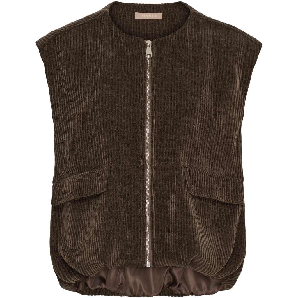 Den smukke fløjlsvest fra Marta er et absolut musthave til dig, der elsker lag-på-lag og ønsker et stilfuldt, men afslappet look. Vesten er lavet i samme bløde, brede riflet fløjlsmateriale som de populære bukser – og tilsammen skaber de et superlækkert sæt, der både føles luksuriøst og utrolig behageligt.