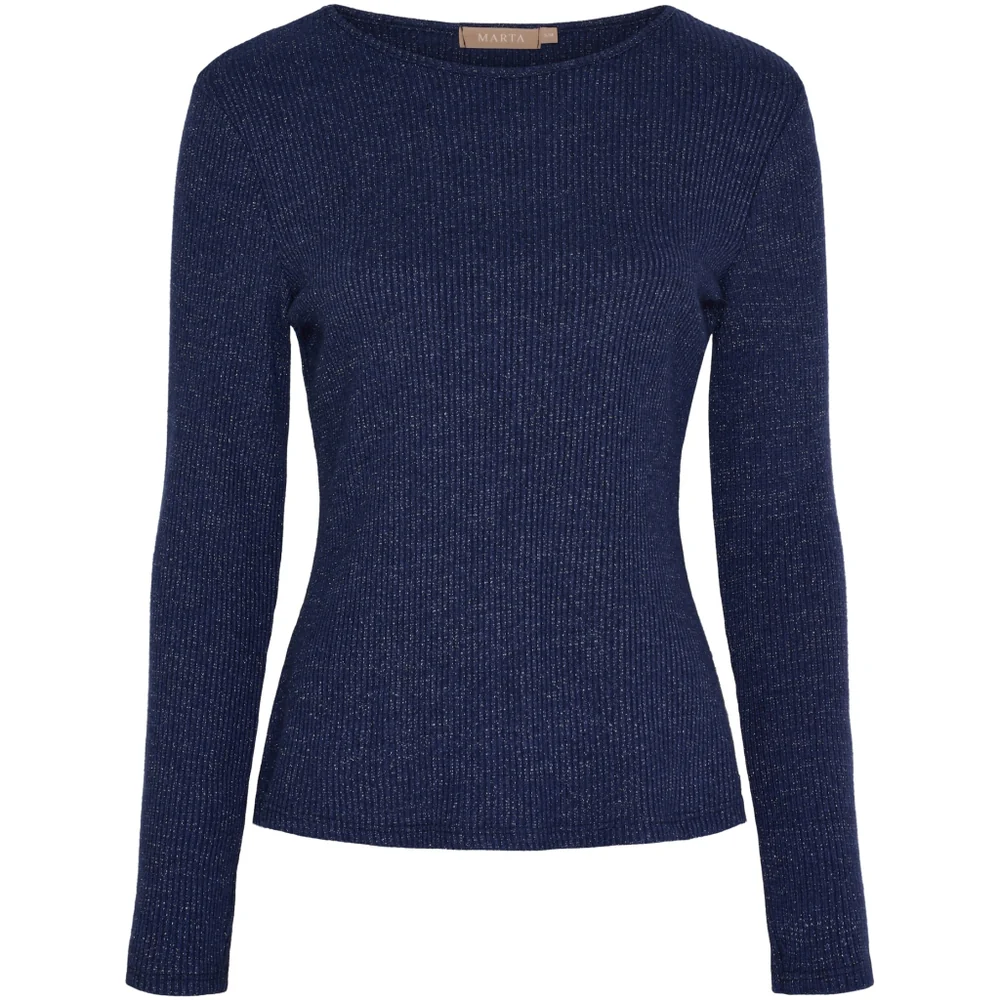 Smuk ribbet bluse fra Marta i en lækker, blød kvalitet med diskret sølvglimmer fra lurex. Den fine blå farve kombineret med den lette glans giver blusen et elegant udtryk, som nemt kan styles både til hverdag og fest. Blusen har rund hals, lange ærmer og en feminin pasform, der følger kroppen uden at stramme.