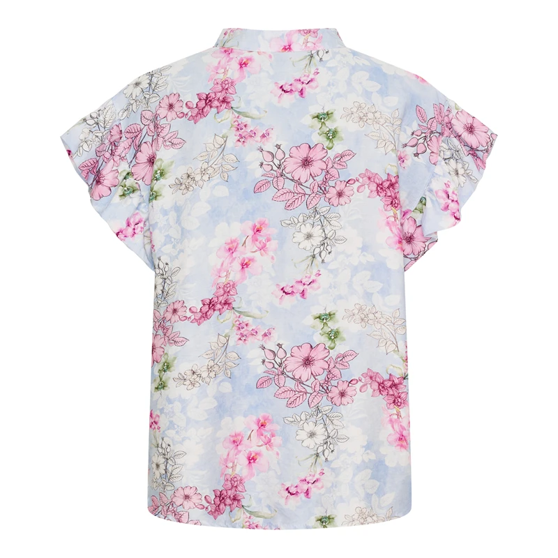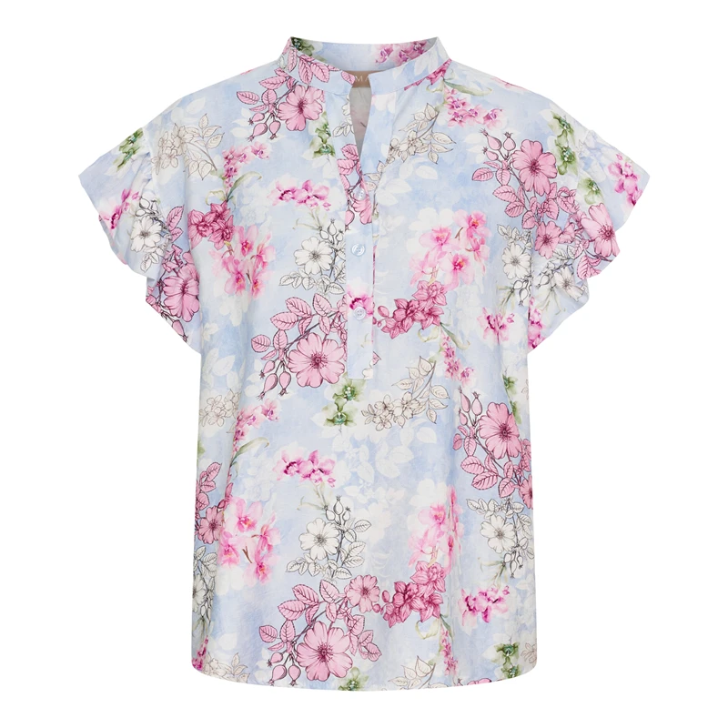 Blusen er lavet i 100% viskose, som gør den let, åndbar og utrolig behagelig at have på. De korte ærmer med let vidde og den fine stolpelukning ved halsen giver et feminint og afslappet udtryk.