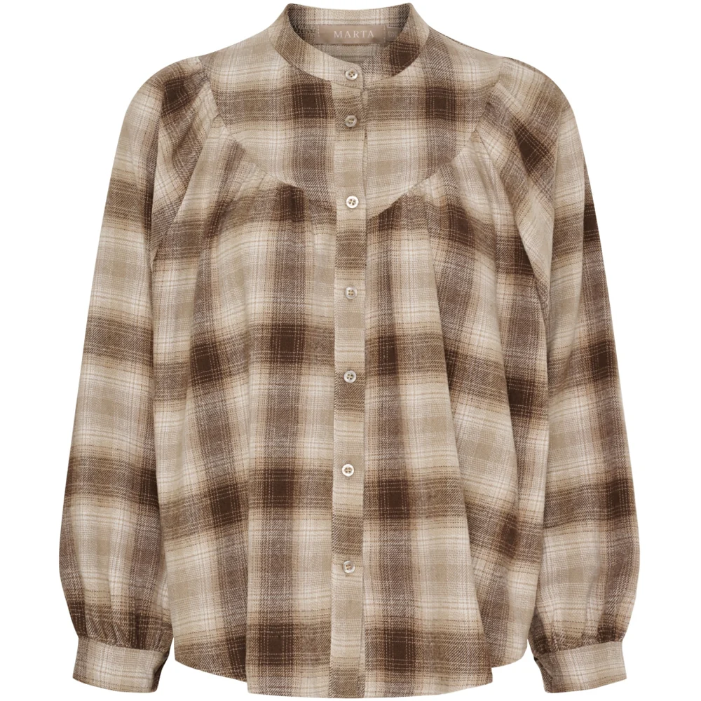 Elegant ternet skjorte fra Marta du Château i bløde nuancer af brun og beige. Skjorten er i one size og har en feminin rund hals med knaplukning hele vejen ned samt let puffede ærmer med manchetter.