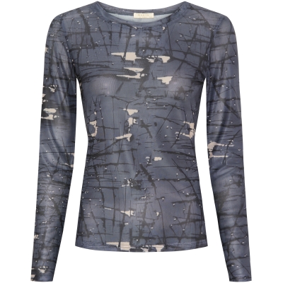 Denne smukke mesh-bluse er perfekt som basislag under kjoler, strik og blazere. Den ultralette og strækbare kvalitet gør den behagelig at have på hele dagen, samtidig med at den giver et elegant og moderne udtryk. Det flotte mønster i blå/grå nuancer tilfører ekstra kant og gør blusen ideel både til hverdag og fest.