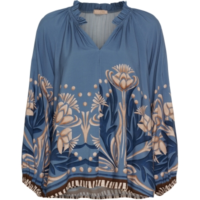 Smuk og feminin bluse fra Marta du Château i en skøn blå nuance med eksklusivt blomsterprint i sandfarvede toner. Blusen har en flatterende pasform med V-udskæring og fine rynkedetaljer ved hals og ærmer, der giver et let og elegant fald.
