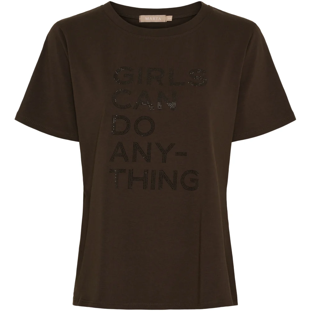 Opgrader din basisgarderobe med denne skønne brune T-shirt fra Marta, designet med et stilfuldt statement: “Girls Can Do Anything” i fine, diskrete sten. T-shirten har en flot pasform, korte ærmer og et blødt materiale, der gør den perfekt til både jeans, nederdele og under en blazer.