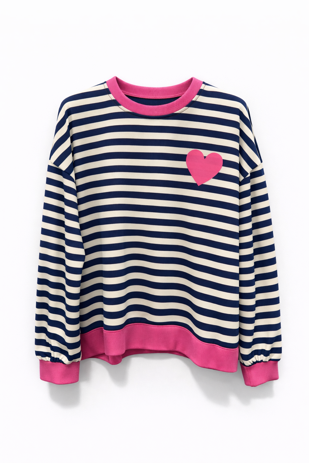 Denne smukke stribede sweat fra Marta i lækker bomuldskvalitet. Den er designet i klassiske navy/råhvide striber med friske pink detaljer og et sødt hjerte på brystet, som giver et feminint og sporty look.