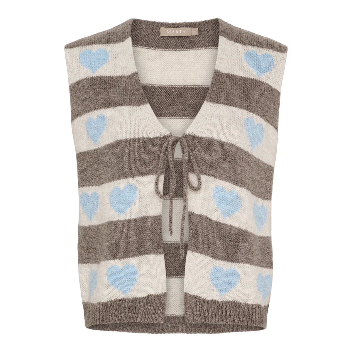 Blød og hyggelig strikvest fra Marta med brede striber i brune og cremefarver, pyntet med søde blå hjerter. Vesten har V-udskæring, bindebånd foran og et afslappet fit, der gør den perfekt til at style over skjorter, kjoler eller langærmede bluser.
