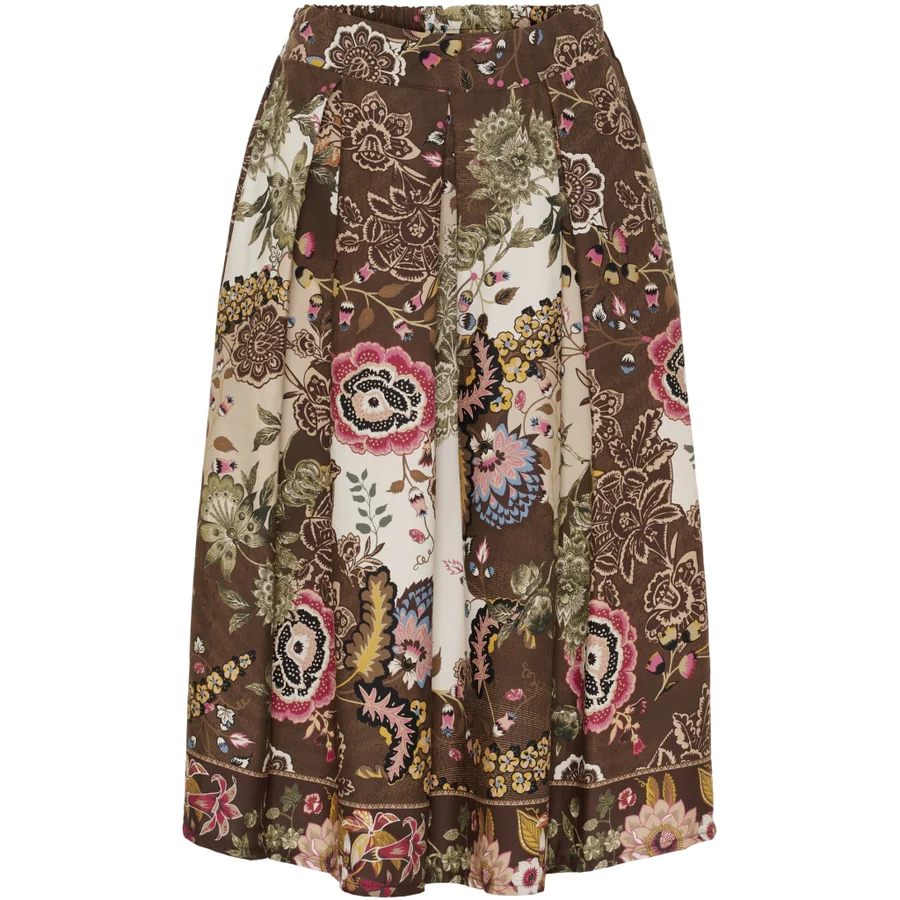 Smuk og feminin nederdel med et eksklusivt blomsterprint i varme brune, creme og rosa nuancer. Designet med brede læg, der giver et flot fald, og en bred linning for ekstra komfort og pasform. Perfekt til både hverdag med en strik eller t-shirt, eller til fest med en elegant top og støvler.