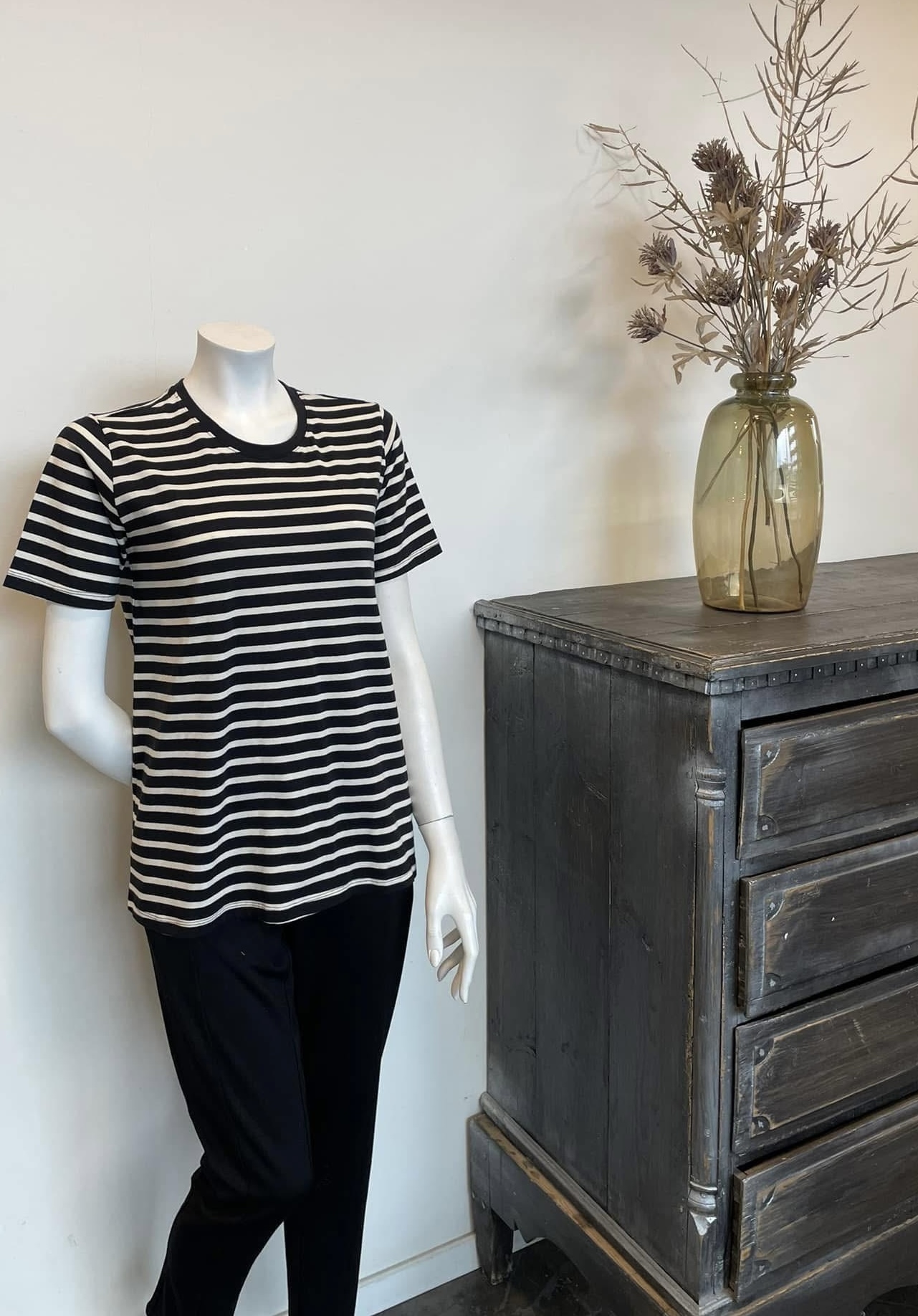 Klassisk stribet t-shirt i en skøn bomulds jersey kvalitet. Denne T-shirt er med rund hals og er så enkel og fin her til foråret. Styl denne t-shirt til et par jeans eller et par shorts til sommer