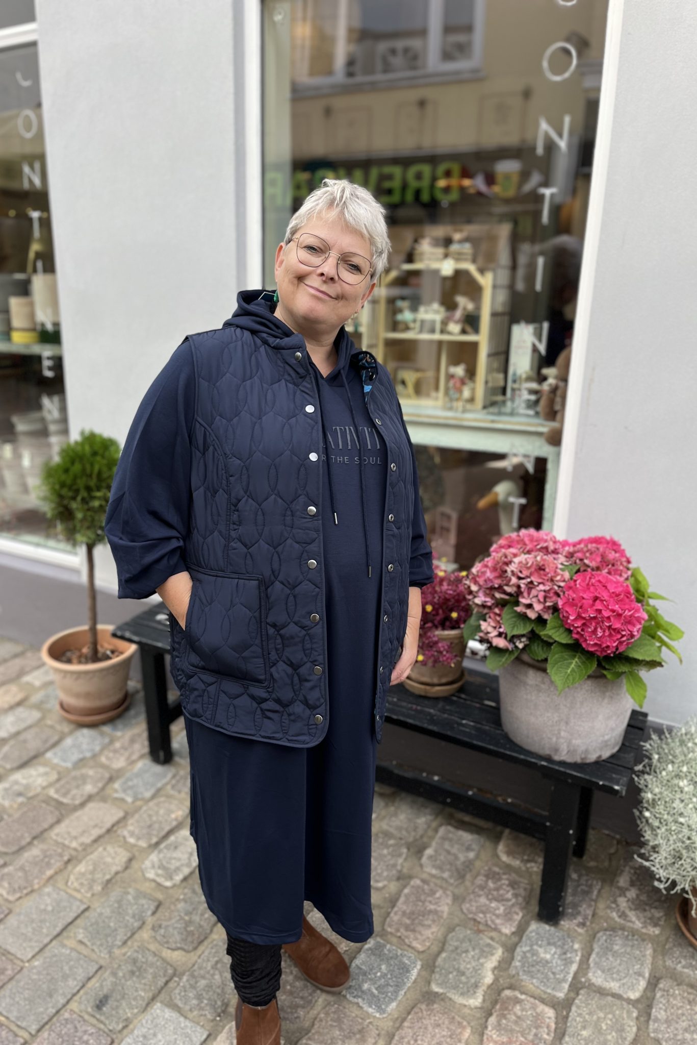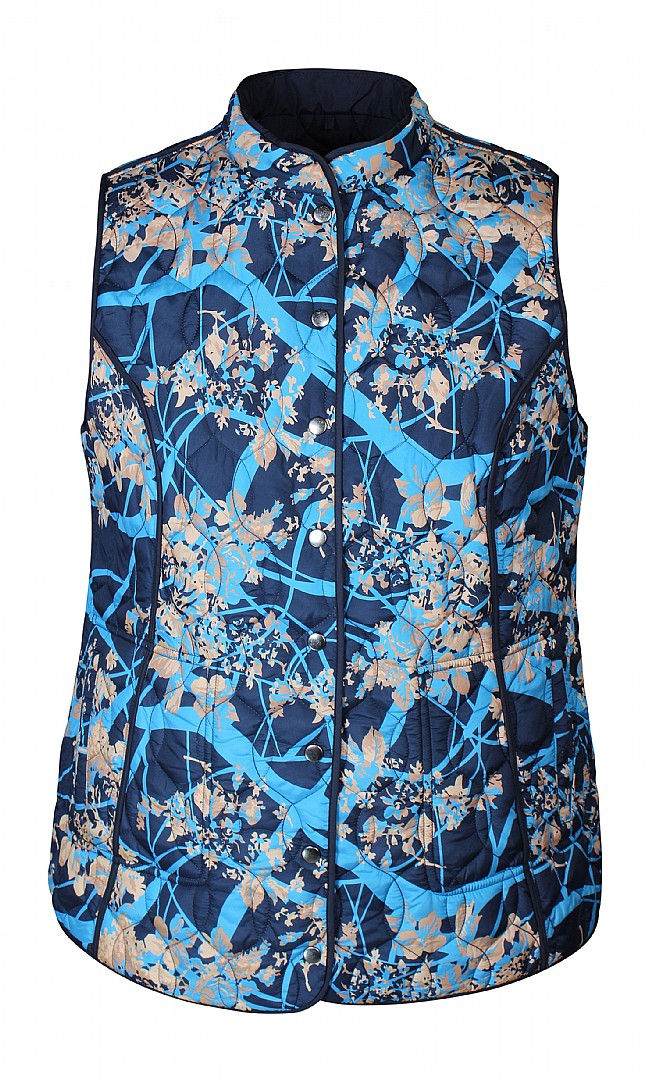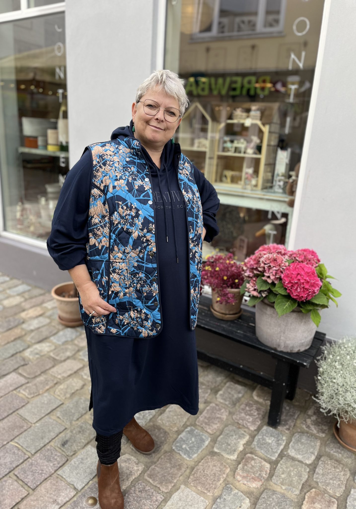 Denne Smart vendbar vest fra Zhenzi er meget populær både som inde men også som ude vest. Den ene side er ensfarvet Navy og den er anden side er printet i Petrol farver. Vesten er med 2 lommer, både på den ene og anden side. Vesten lukkes med trykknapper