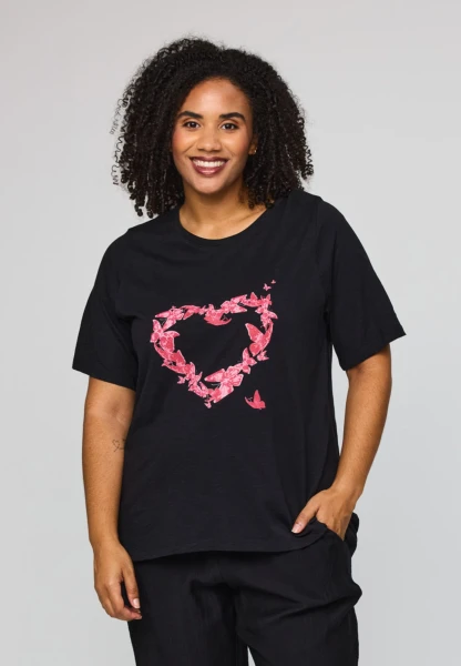 Den sorte bund giver et stilrent look, mens det flotte pink hjerteprint tilfører et feminint og iøjnefaldende twist.