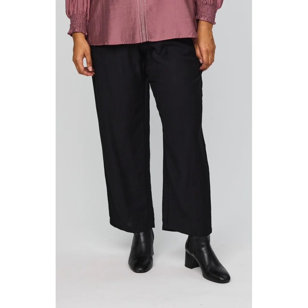 Materialet har en glat og let overflade med et blødt fald. Kombinationen af viscose og nylon giver en behagelig komfort og en let struktur, som gør bukserne rare at have på hele dagen.