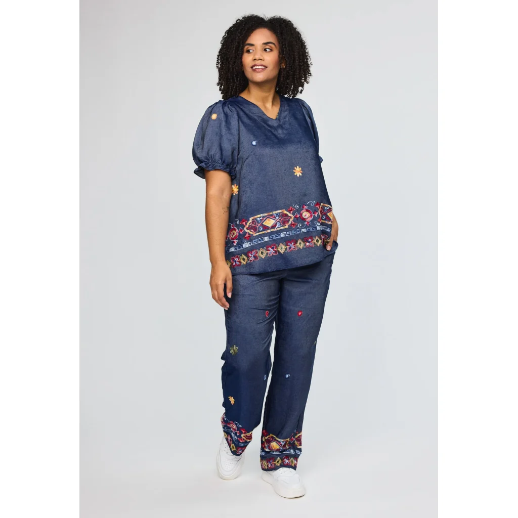 En bluse med et afslappet og dekorativt udtryk. Modellen har en løs silhuet, der falder blødt omkring kroppen og giver en behagelig og ubesværet pasform.